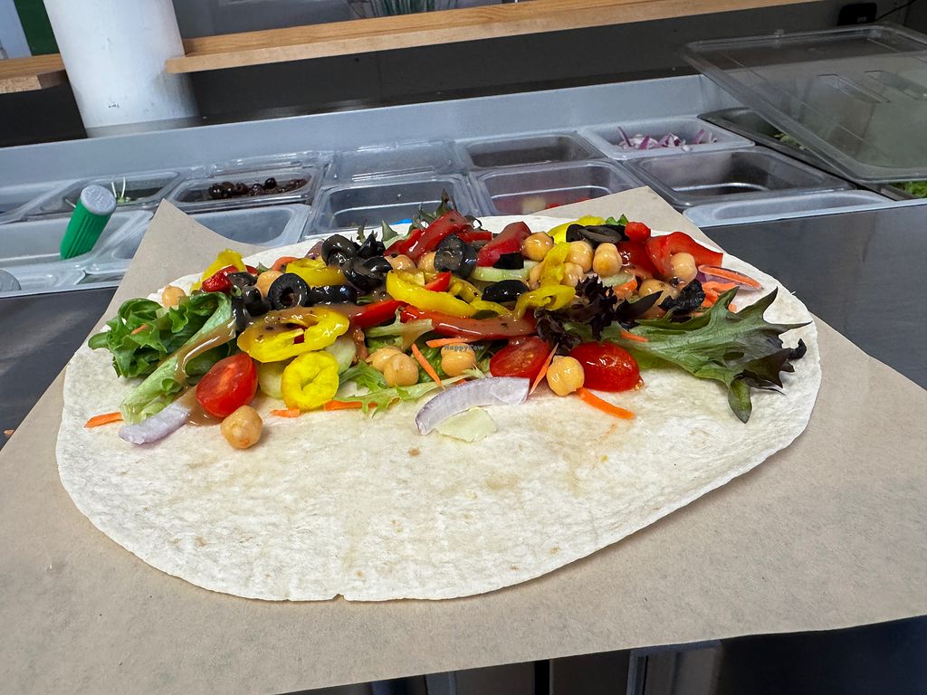 This place has customizable wraps, salads, baked potatoes, quesadillas and bowls. More than half of the toppings and proteins are vegan. I got a baked potato topped with vegan chili, broccoli, jalapenos, vegan cheese sauce, and sour cream. So good!