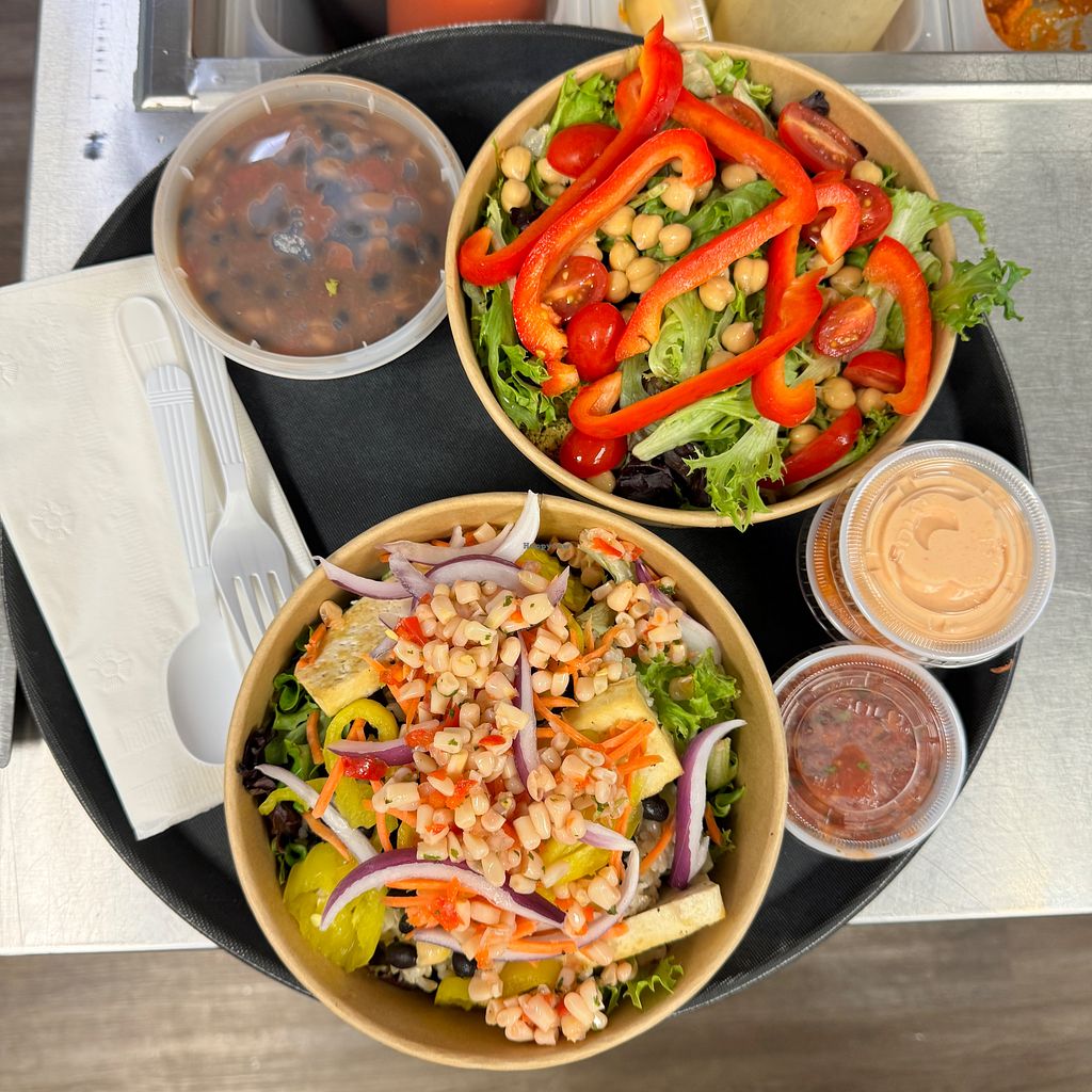 Great variety of suggested menu items as well as bases to build your own meals, including baked potatoes as bases, which can be topped with award-winning vegan chili and vegan cheese and sour cream. We got potato bowls and added our own custom toppings. They also had vegan black bean brownies and energy bites.
