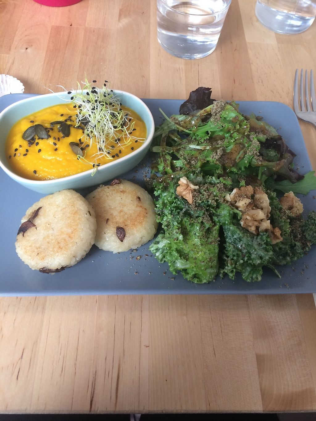 Plat du jour. Squash and carrot purée, galettes of rice with mushrooms…