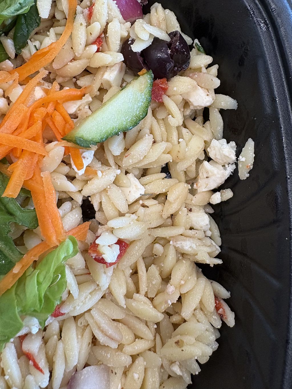 The falafel was spiced well and overall tasty, and with veg and hummus it made a pretty good wrap. I was disappointed to find that some items labeled vegan were in fact, clearly not vegan. The orzo pasta contains feta😒 I was also a bit hesitant when the person mentioned the rice was made with chicken spice.
