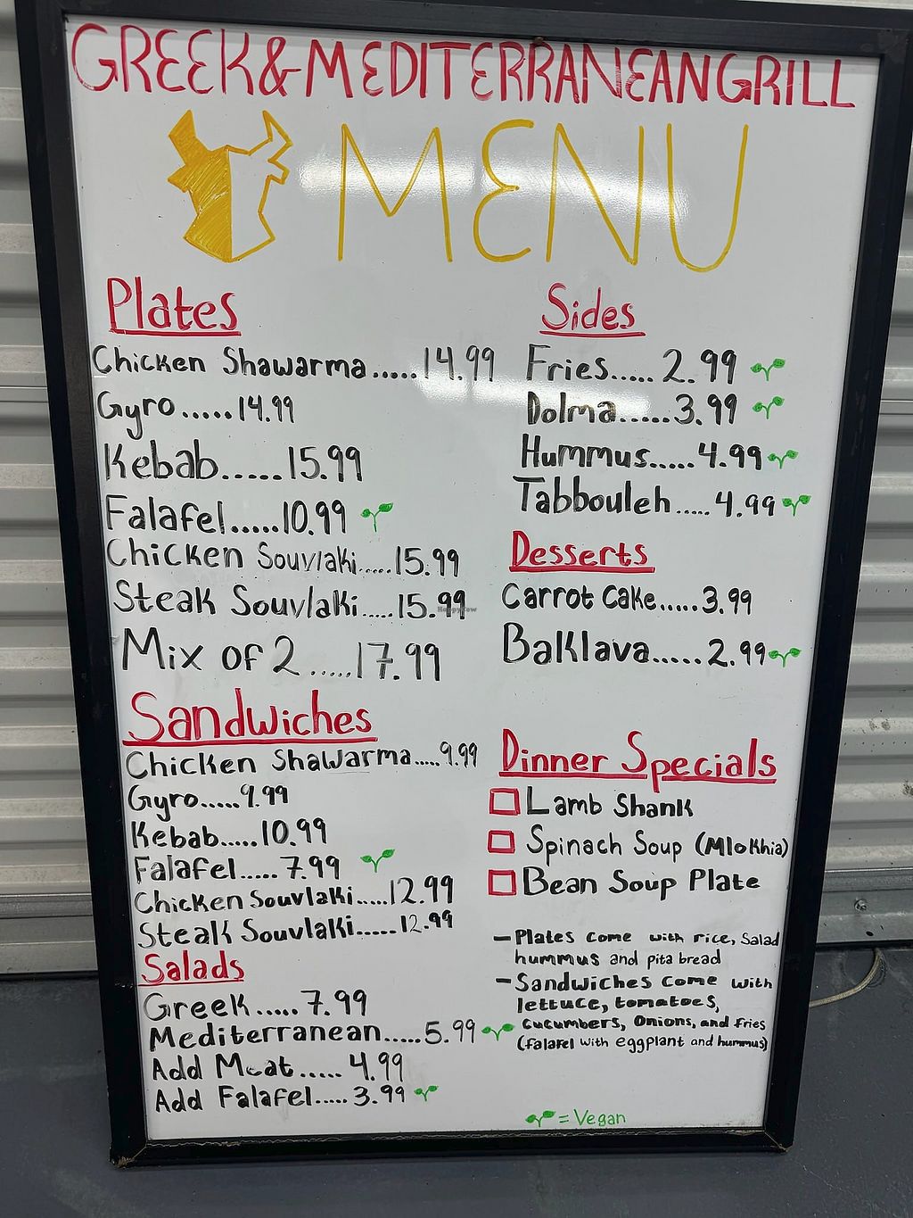 Serves meat, vegan options available. Mediterranean food truck with vegan choices. Menu includes hummus, Mediterranean salad, stuffed grapes leaves and falafel. Reported open November 2024. Check Facebook for hours.