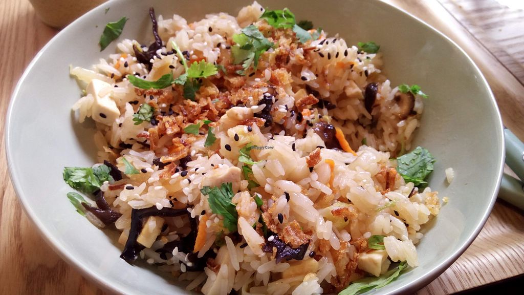 Vegan "wok" with quinoa, bulgur, black mushrooms, coconut curry sauce,…