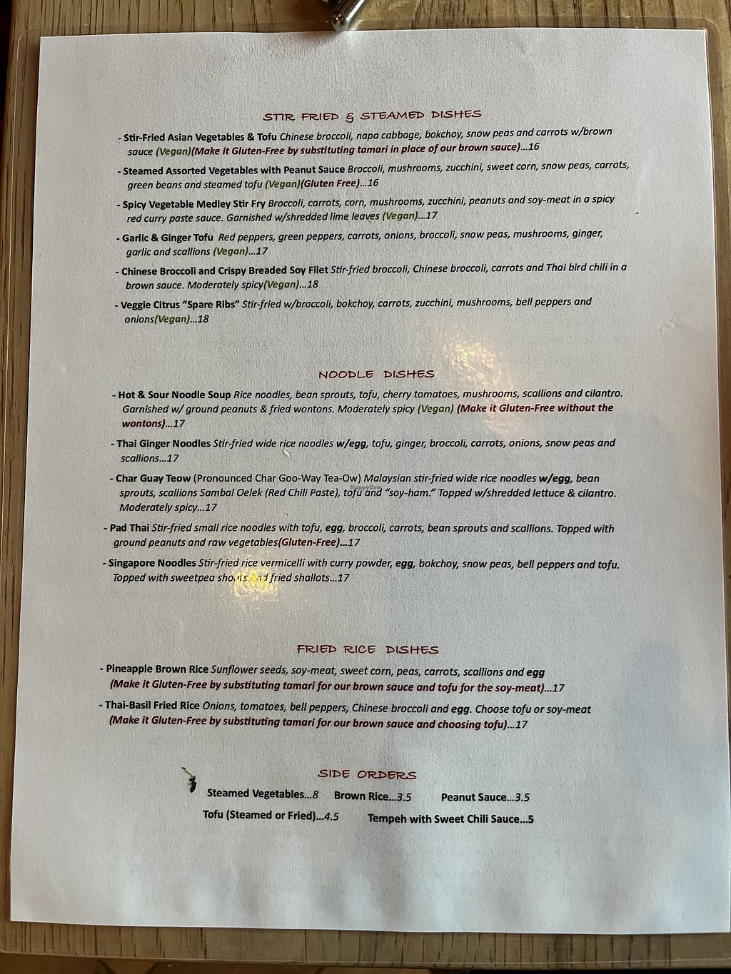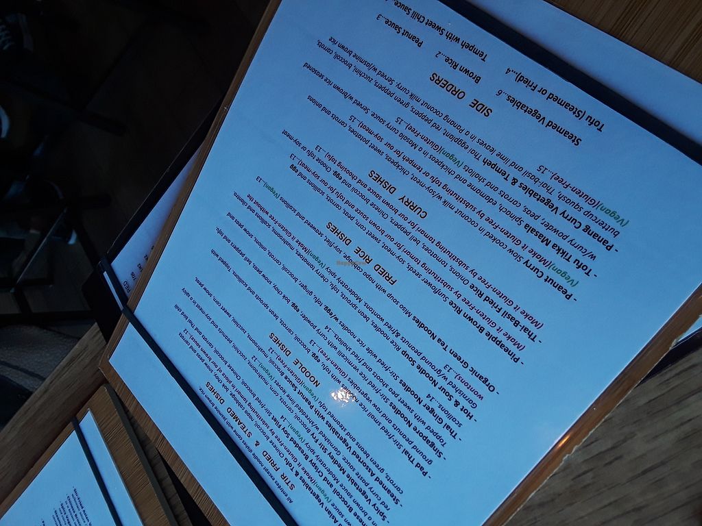 Delicious vegan Thai menu. A big selection all of which are great. Good service and reasonable prices. Try the Vegan Chocolate Mousse pie. It’s amazingly delicious!!!