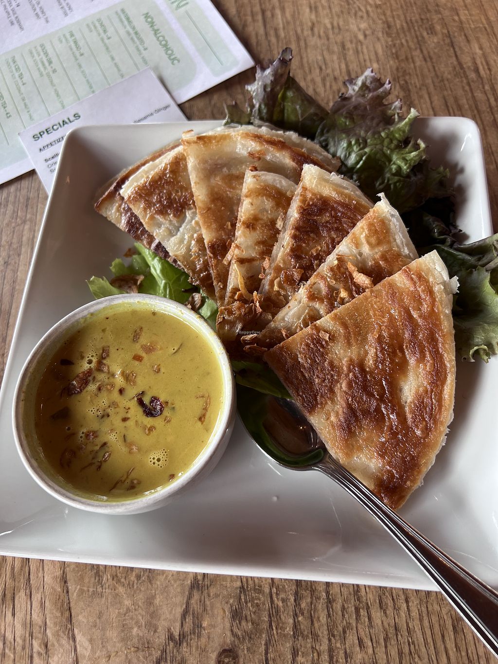 I think they can make everything vegan here. The soup wasn’t my absolute favorite but it did have lots in it and large for the $19 price tag. I enjoyed the seasonal pumpkin tapioca pudding and the Samosas were fine. But truly there are so many other options here at this one vegetarian restaurant in town that it still deserves a high rating. Plus our server Nick was wonderful and the restaurant is lovely inside. Parking is street and we found a close spot after two bouts around.