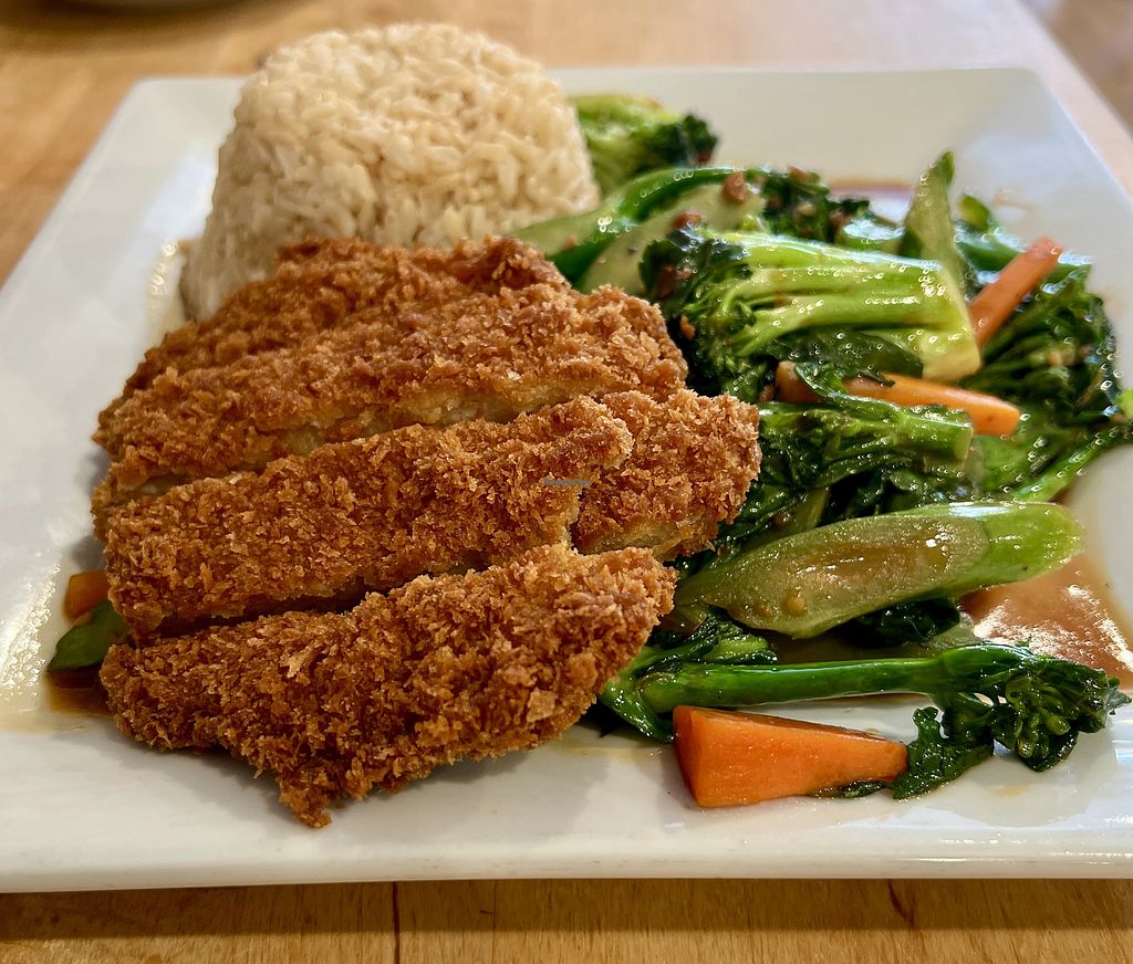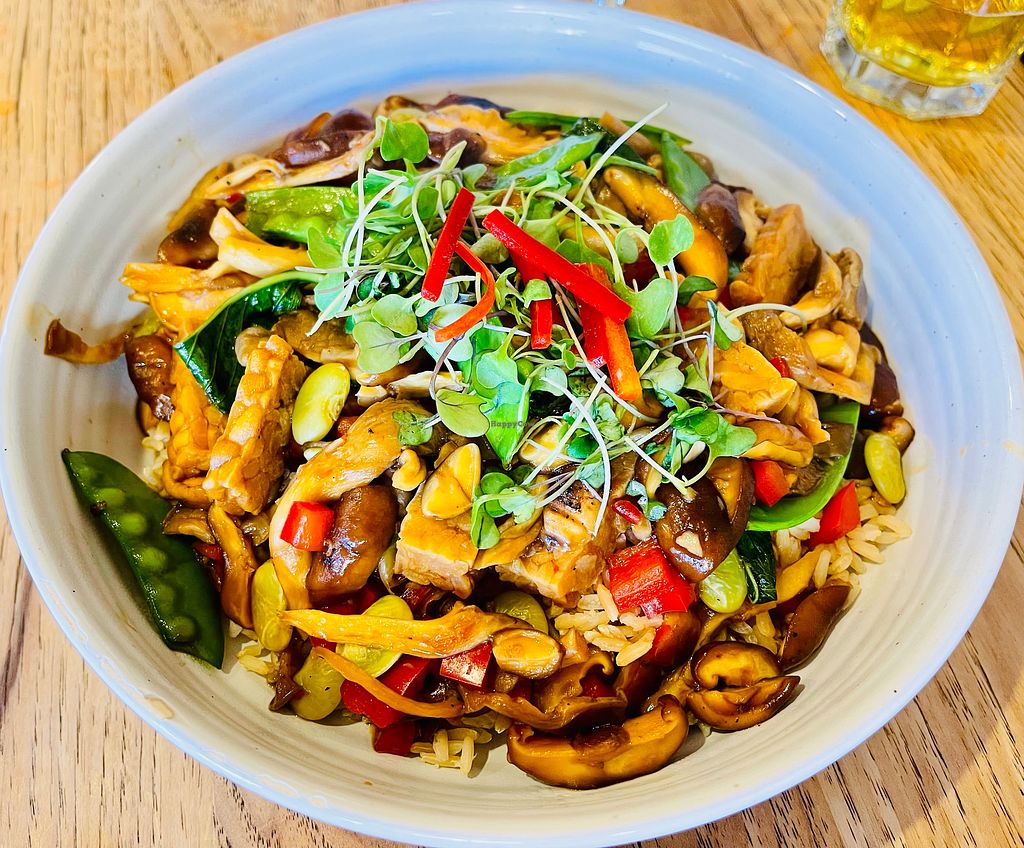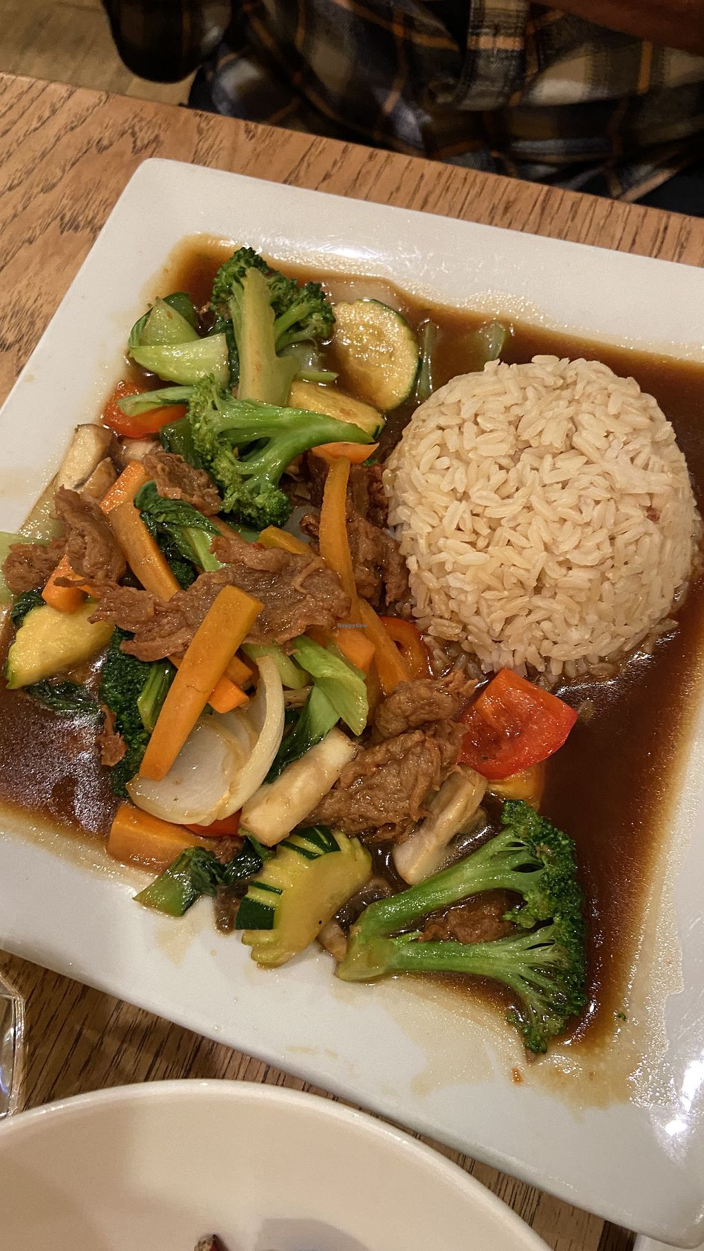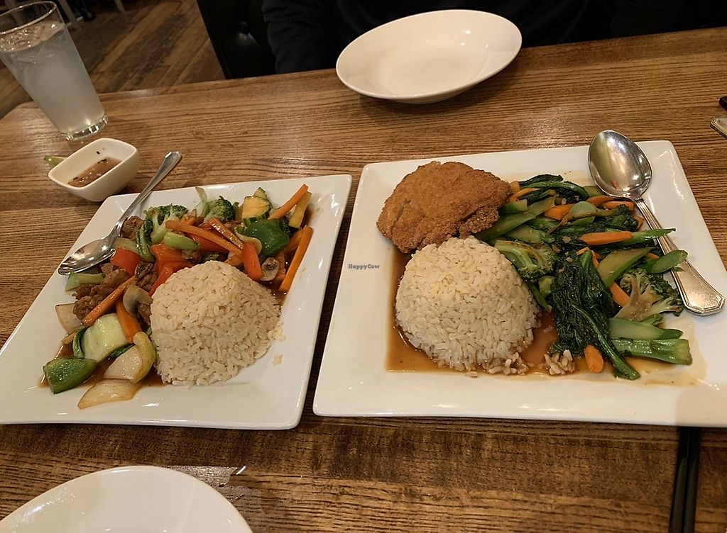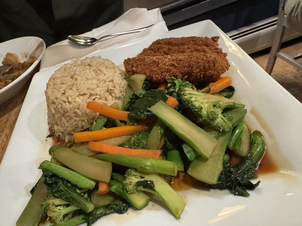 Had the vegan citrus spare ribs stir fried with broccoli, carrots, bok choy, zucchini, snow peas, mushrooms, onions, and bell peppers served with jasmine brown rice - amazing.