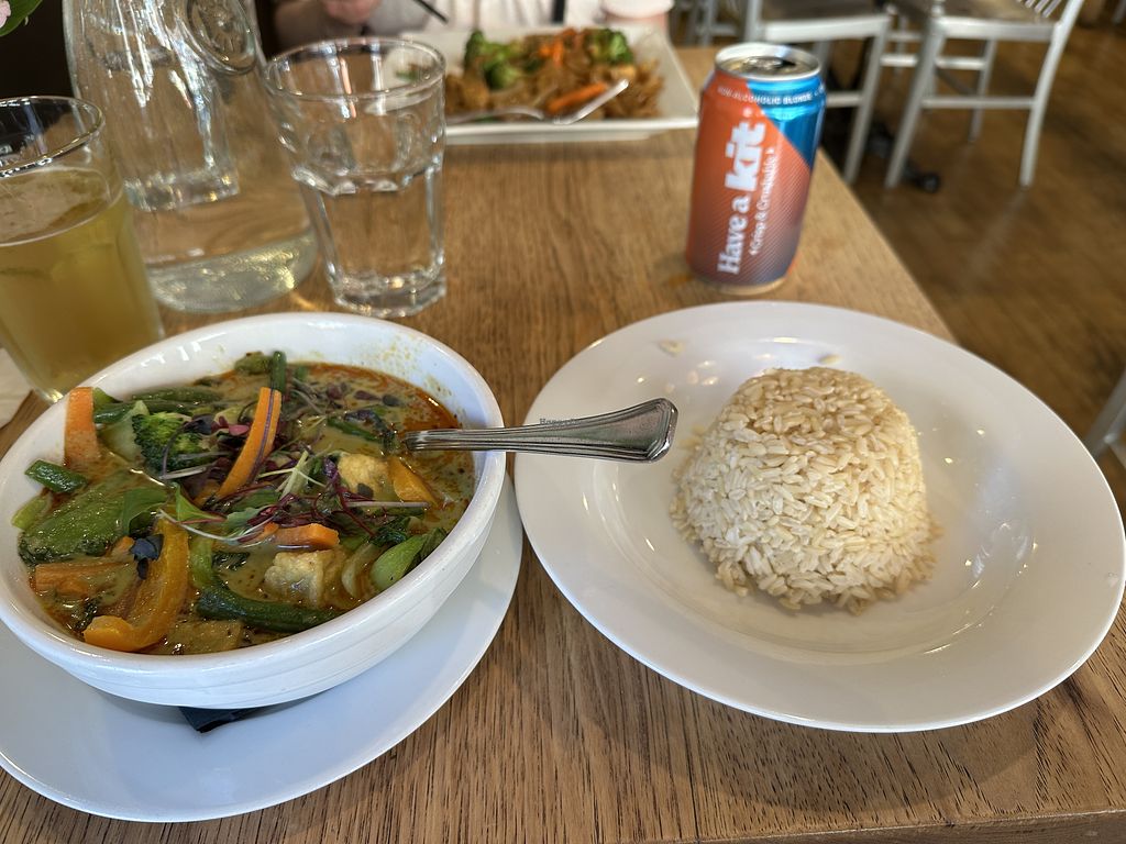 Great green curry! Served warm with spicy options. Pair with the Kit Non-alcoholic beer for an awesome lunch.