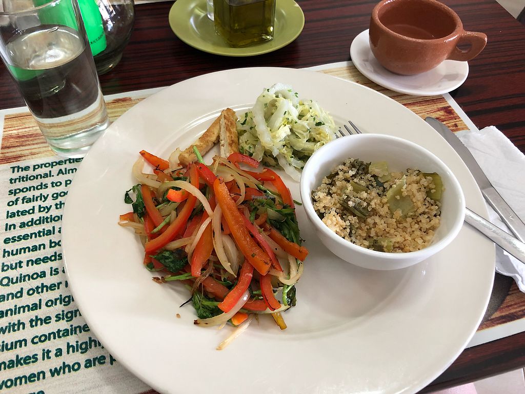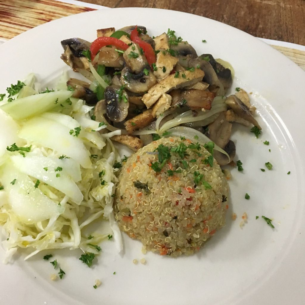 ";Vegan meat"; (seitan) with quinoa, cabbage and veggies