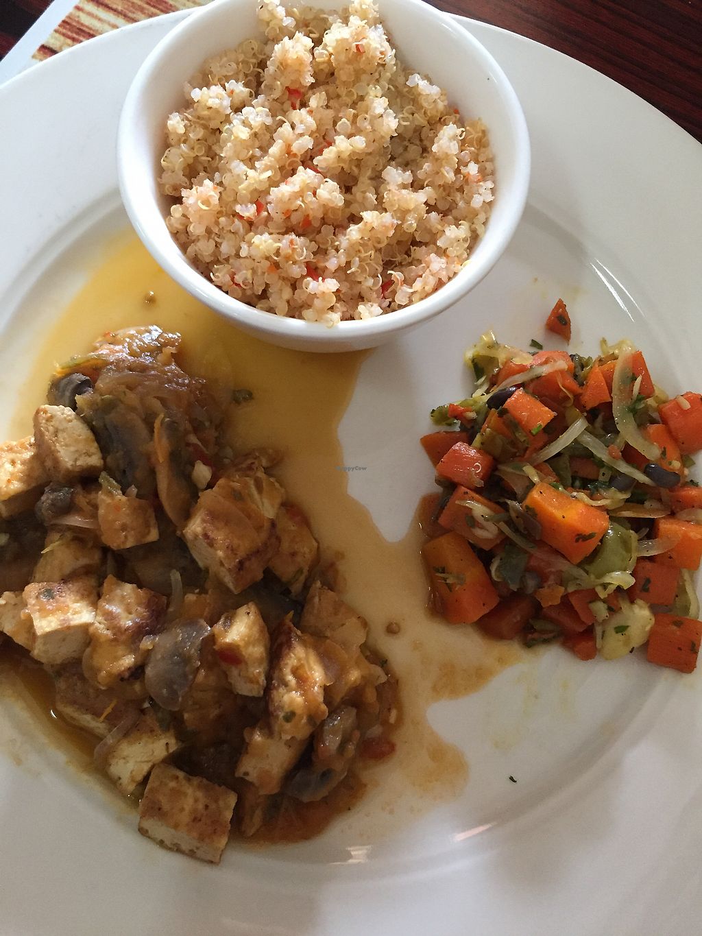 sautéed tofu and mushrooms with quinoa and cabbage and onions
