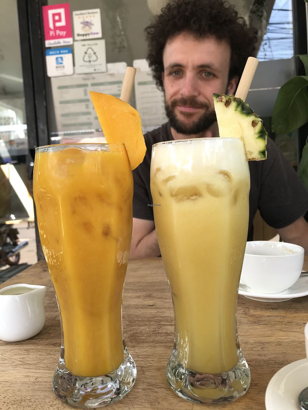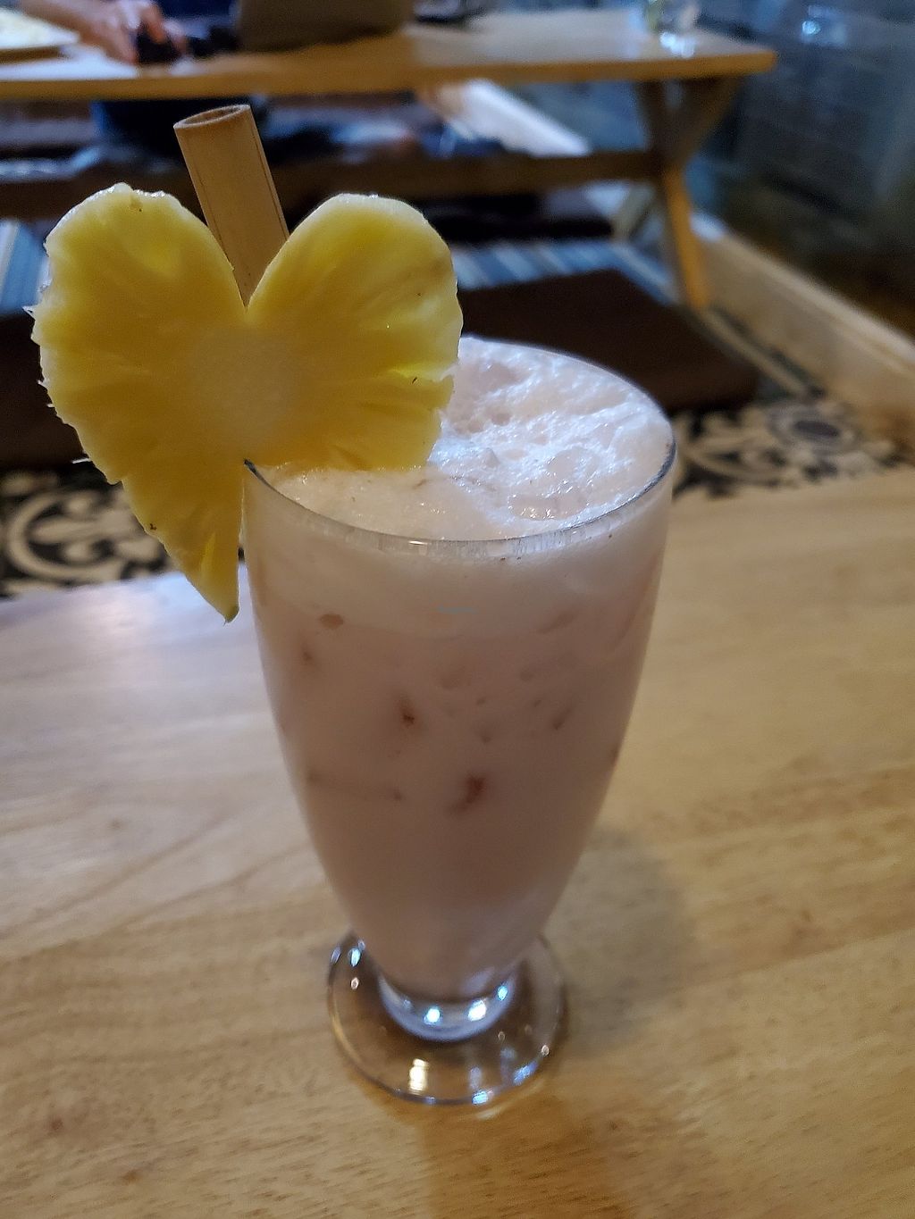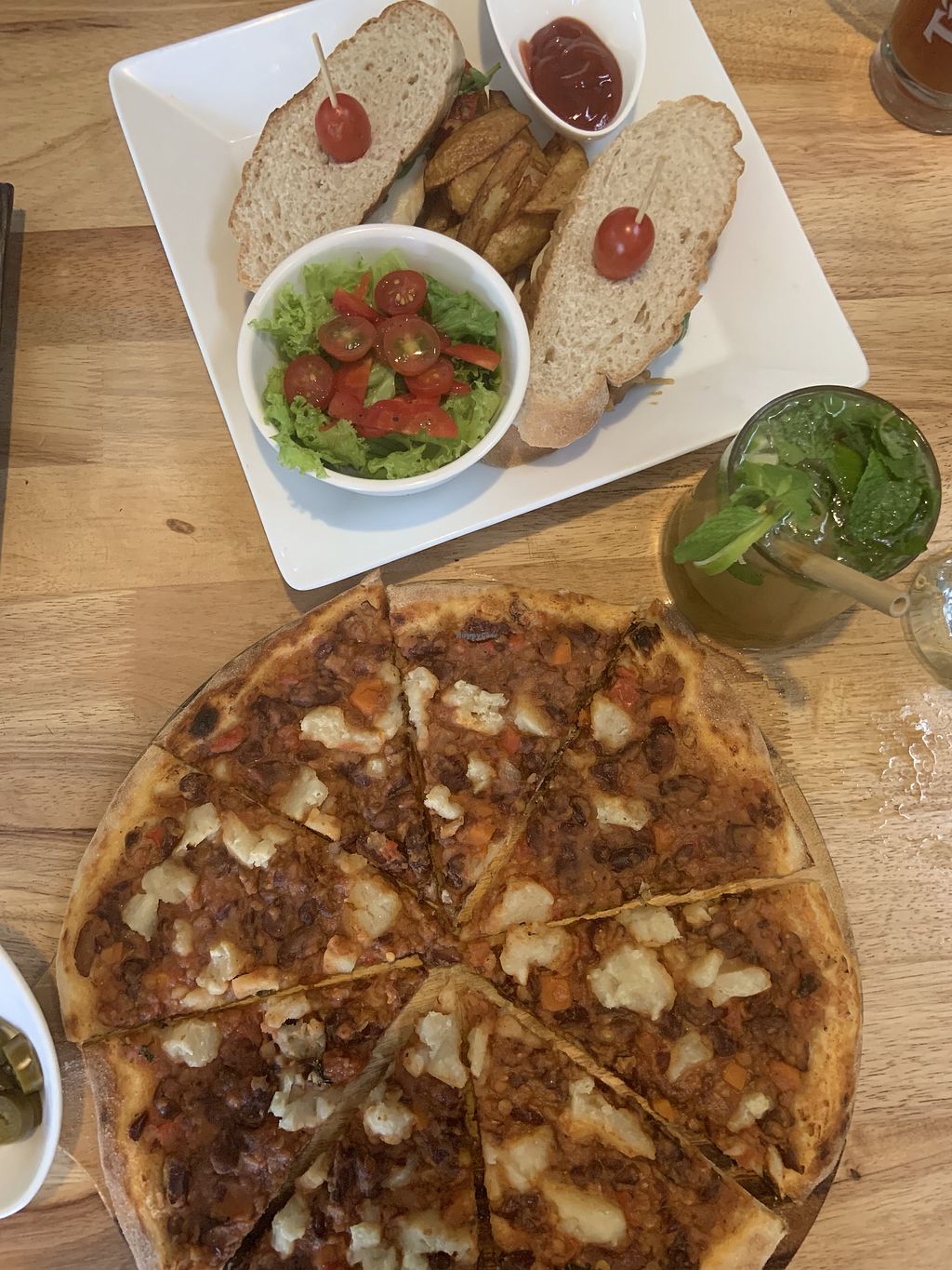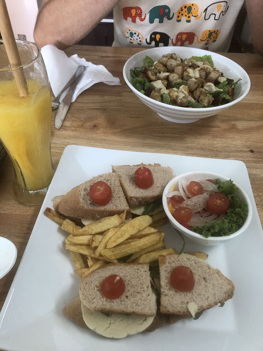 Jackfruit bbq sandwich, mango smoothie, and cesar salad