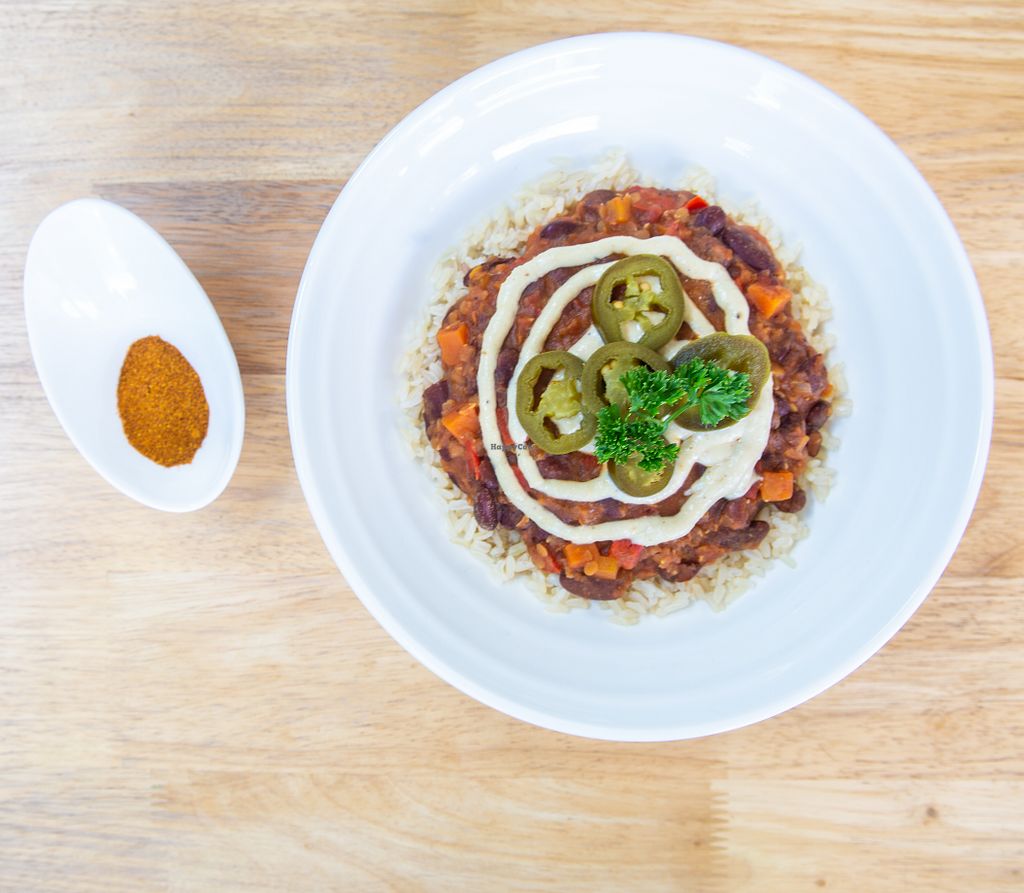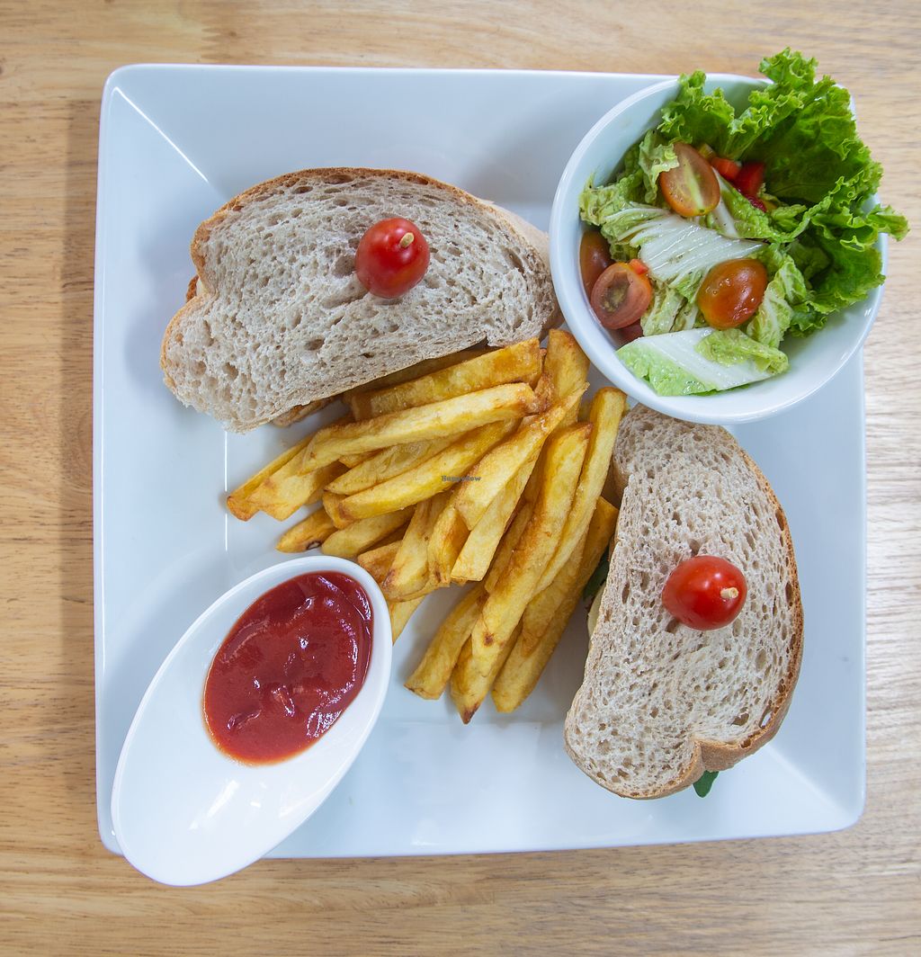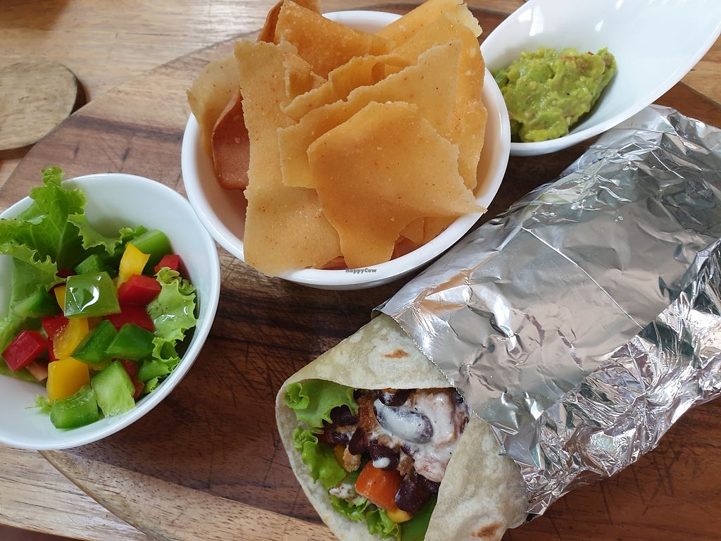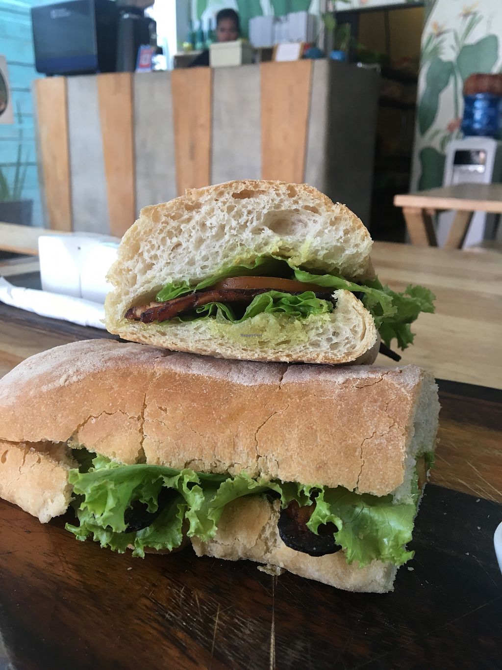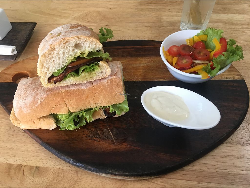 Jackfruit bbq sandwich, mango smoothie, and cesar salad
