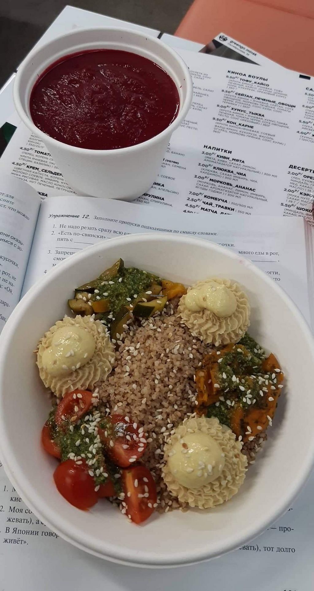 Quinoa Bowl with Baked Vegetables and Seitan. Home made lemonade with…
