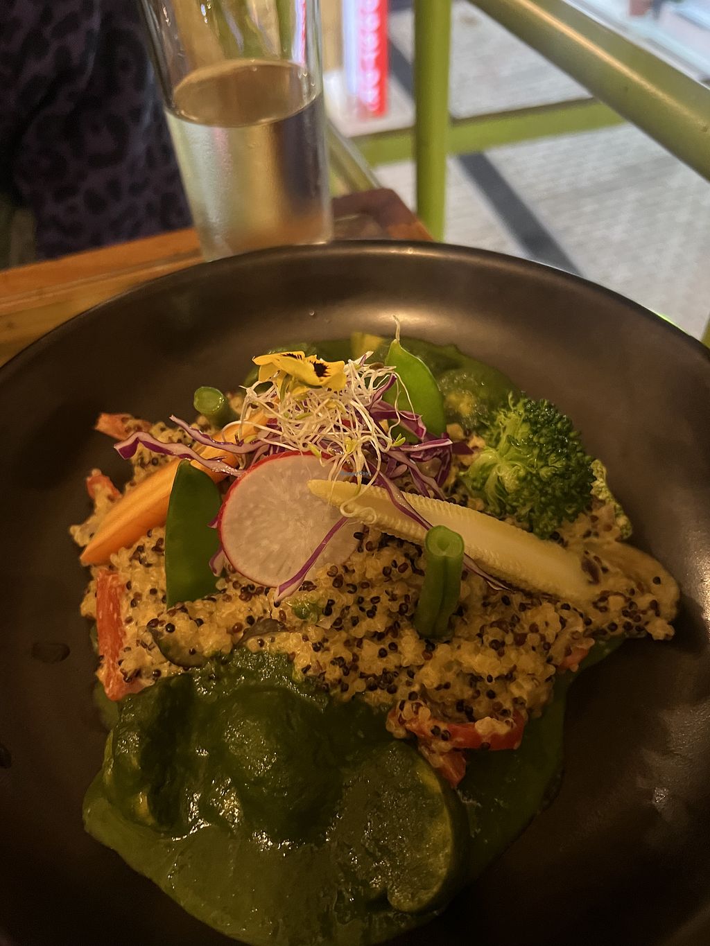 The staff is friendly and the Quinotto Green House is good. The food is listed as vegetarian, but can be made vegan. The upstairs dining area is very hipster and calming.