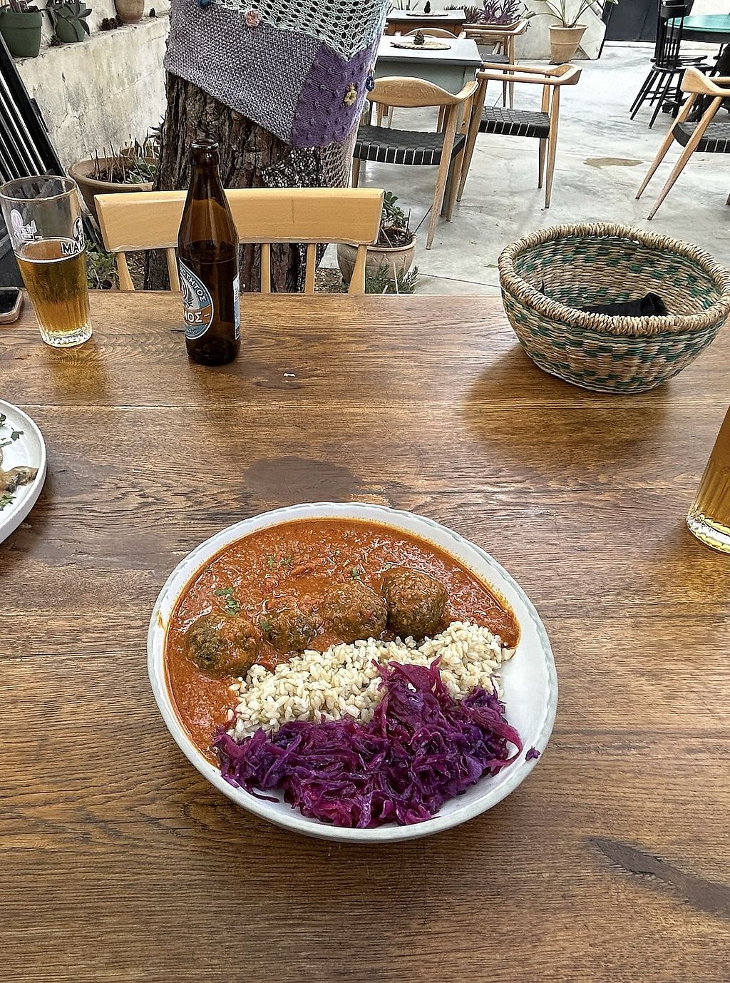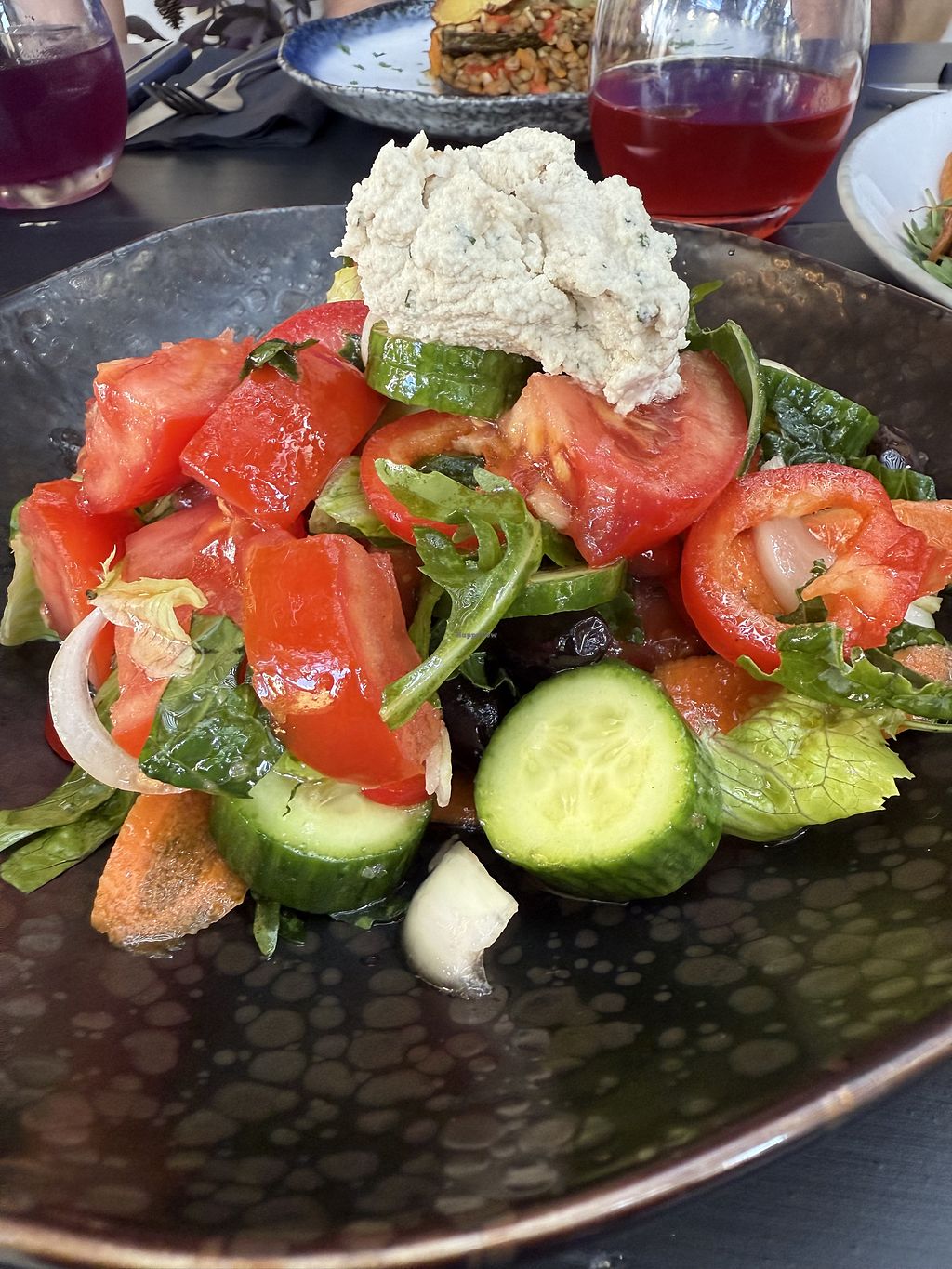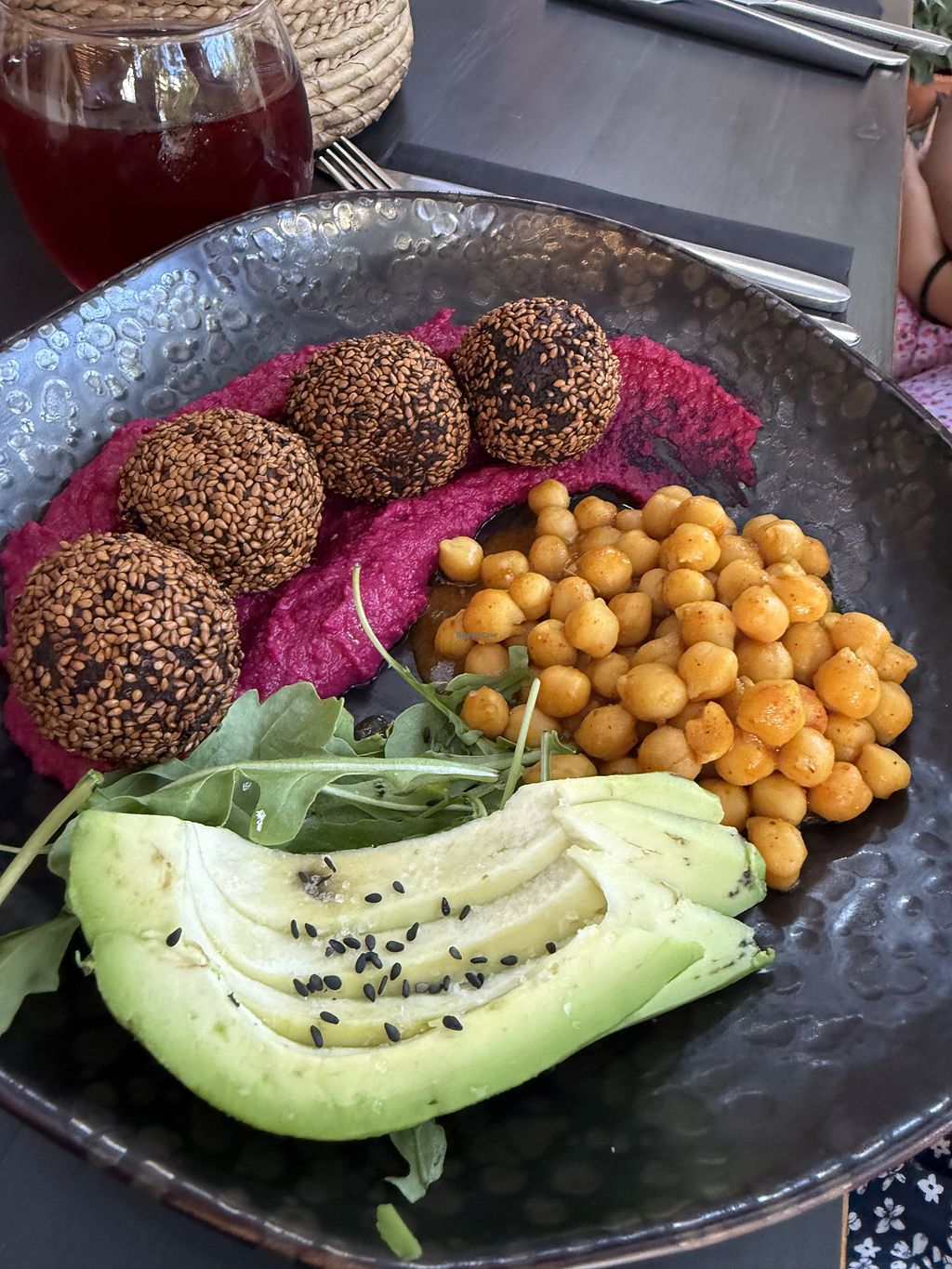 Acabamos en este restaurante debido a que los de Heraklion estaban cerrados y, visto ahora, no pudimos tener más suerte. El sitio es precioso, la chica que lo lleva muy amable y la comida se nota que es casera y está tremendamente rica. Pedimos varios platos para compartir: bol de lentejas y falafel de remolacha con pan casero y de postre tarta de queso y, además, nos invitó a probar el último trozo de brownie que le quedaba y estaba espectacular. Sin duda mereció la pena ir.