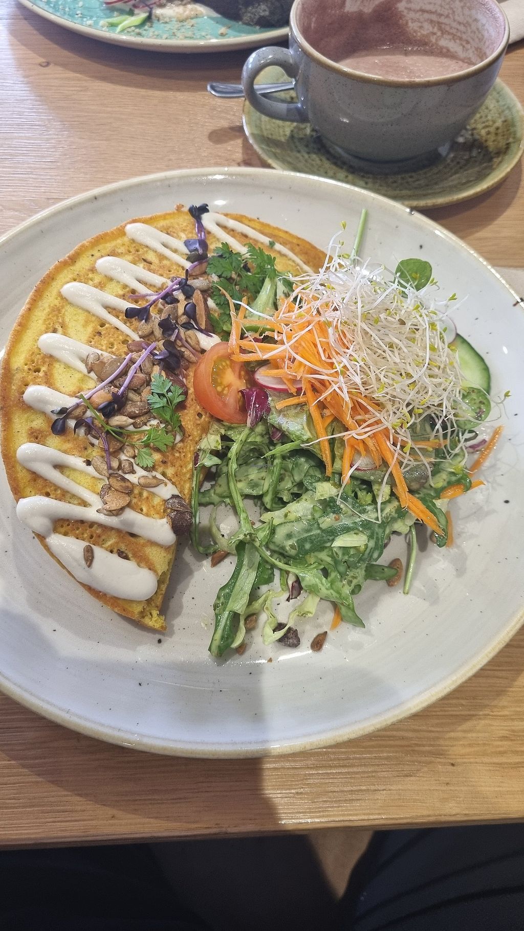 Lovely cafe/restaurant and perfect for breakfast/brunch. The coffee was good and the omelette and waffles were super tasty and beautifully presented! The menu is 100% vegan and you don't have to worry about ordering. The atmosphere is very pleasant and the staff were very, very friendly and cheerful. We were served quickly. If we're in the area again, we know where we'll be having breakfast again!