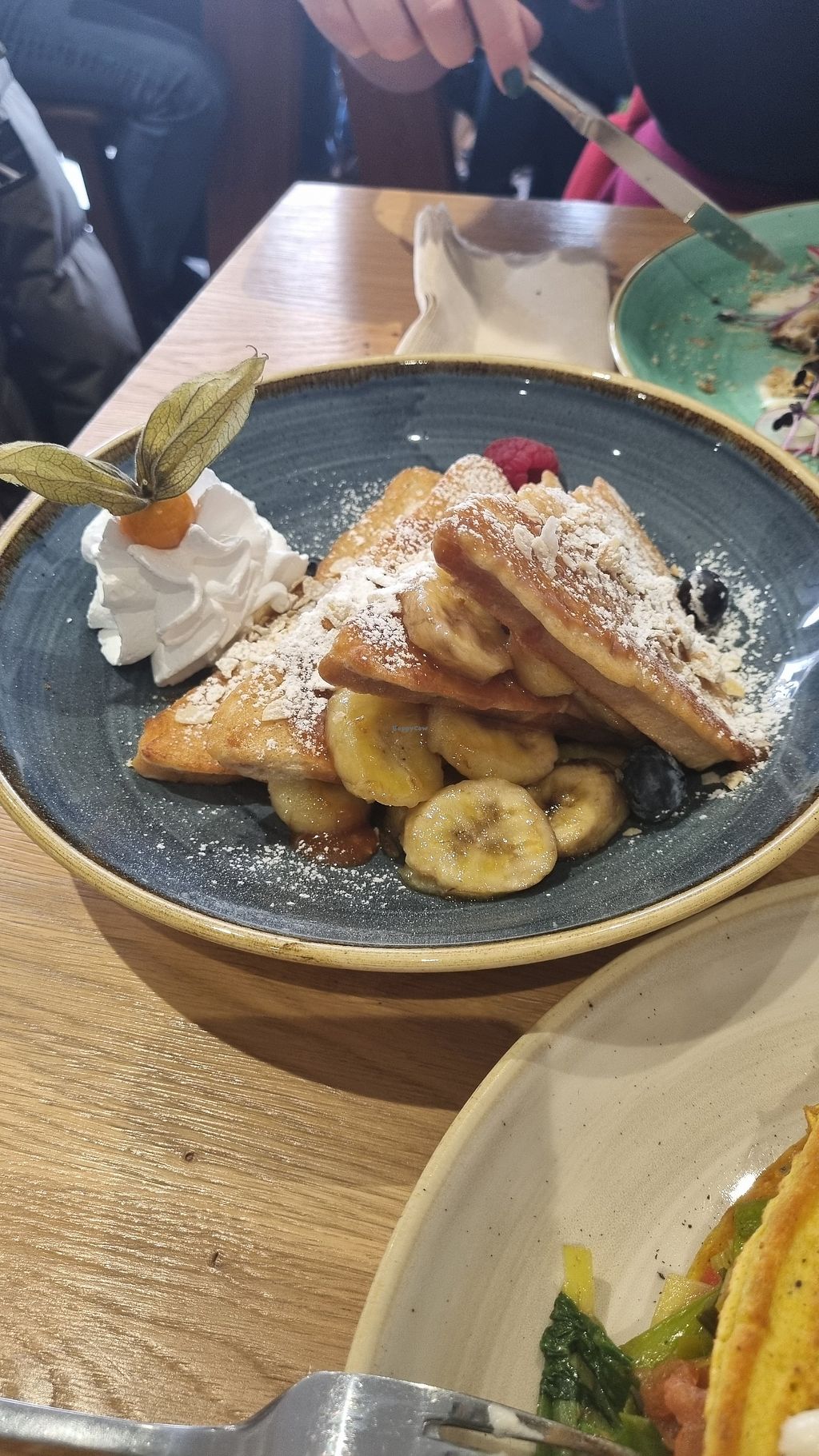 The french toast with banana was amazing! I could eat it everyday. Also the bagel was really good. The stuff is also so lovely.