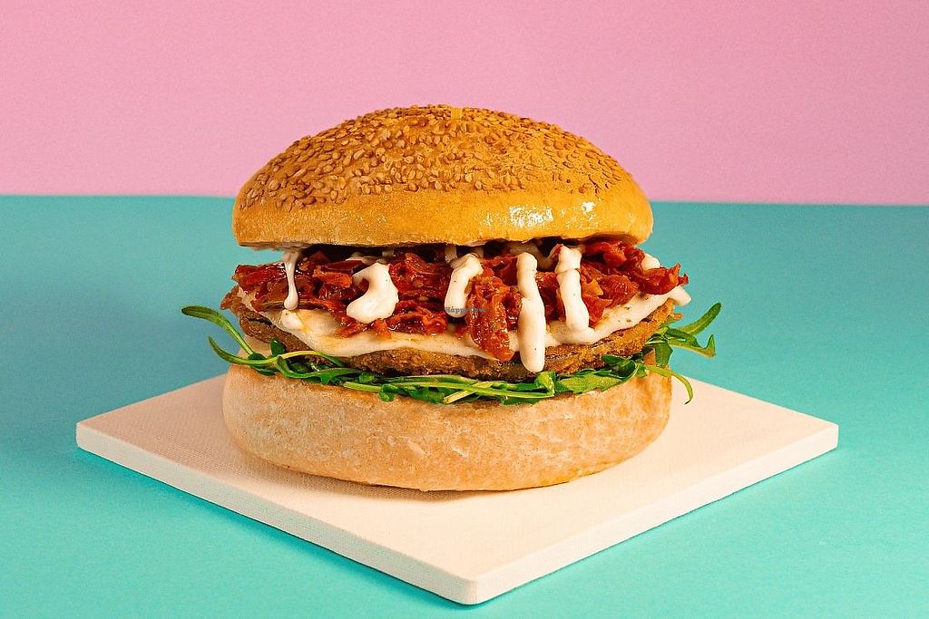 Mama Bun: Eggplant Cutlet, plant-based Provola, sun-dried Tomatoes, Ga…