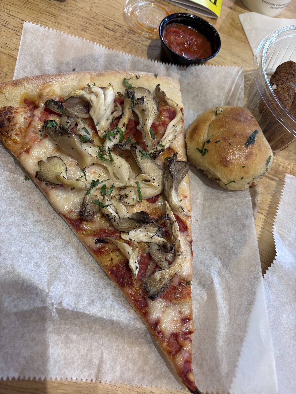 oyster mushroom pizza and garlic knot