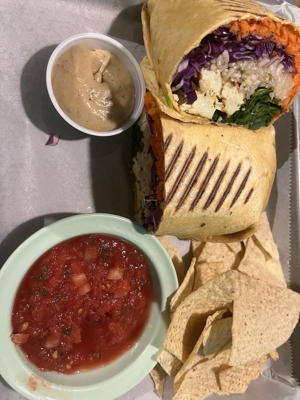 I had the Gold Coast wrap which came with chips and salsa. The portions are large and my meal was delicious. Friendly service. My only complaint is they were out of vegan desserts.