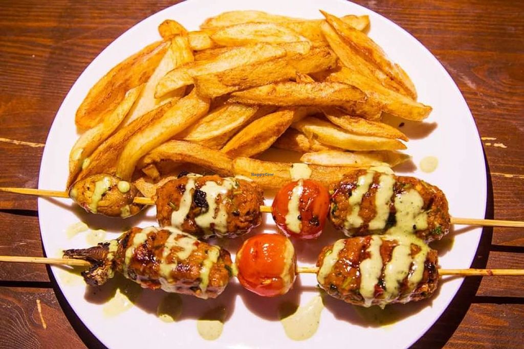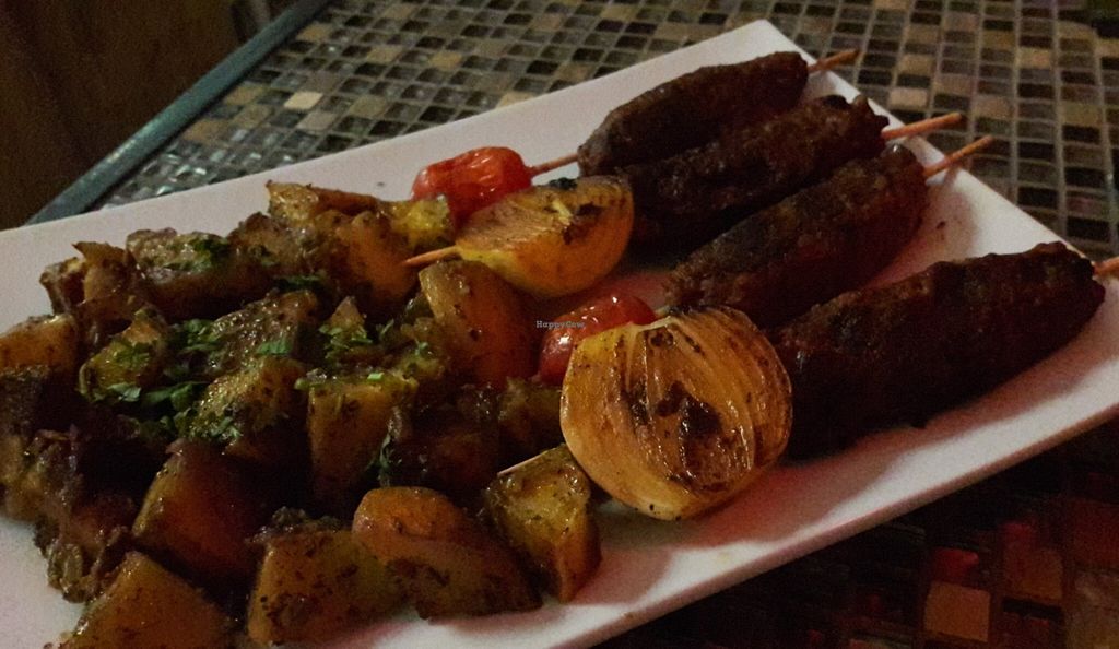 Beet, soy and seitan kebab with home fries.