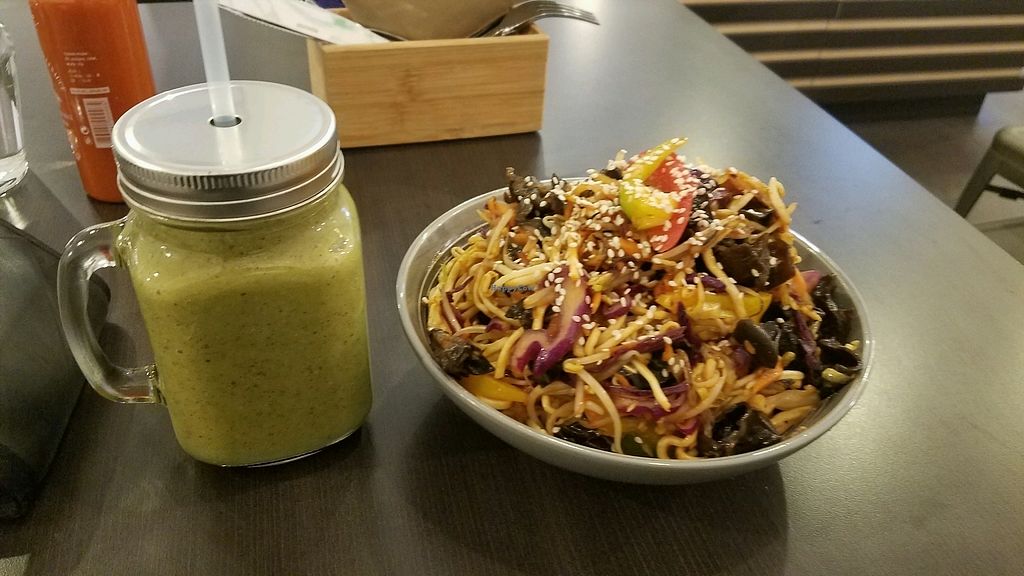 Spicy Mushroom Noodle Bowl with Green Smoothie