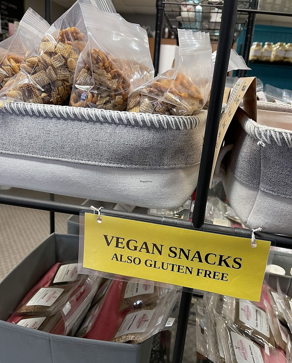I was driving pass and saw the promotion of their “vegan” Buddha Bowl. It’s a very small space, mostly filled with shelves stocked up with everything from pickled fruits and veggies, jams, and baked goods, to vegan Chex-Mix and vegan chocolates. Inside also houses Ann’s Gluten-free Bakery and Cafe, where you can get salads and sandwiches. I saw at least 4 options on the menu that could be made vegan by omitting an ingredient or two.