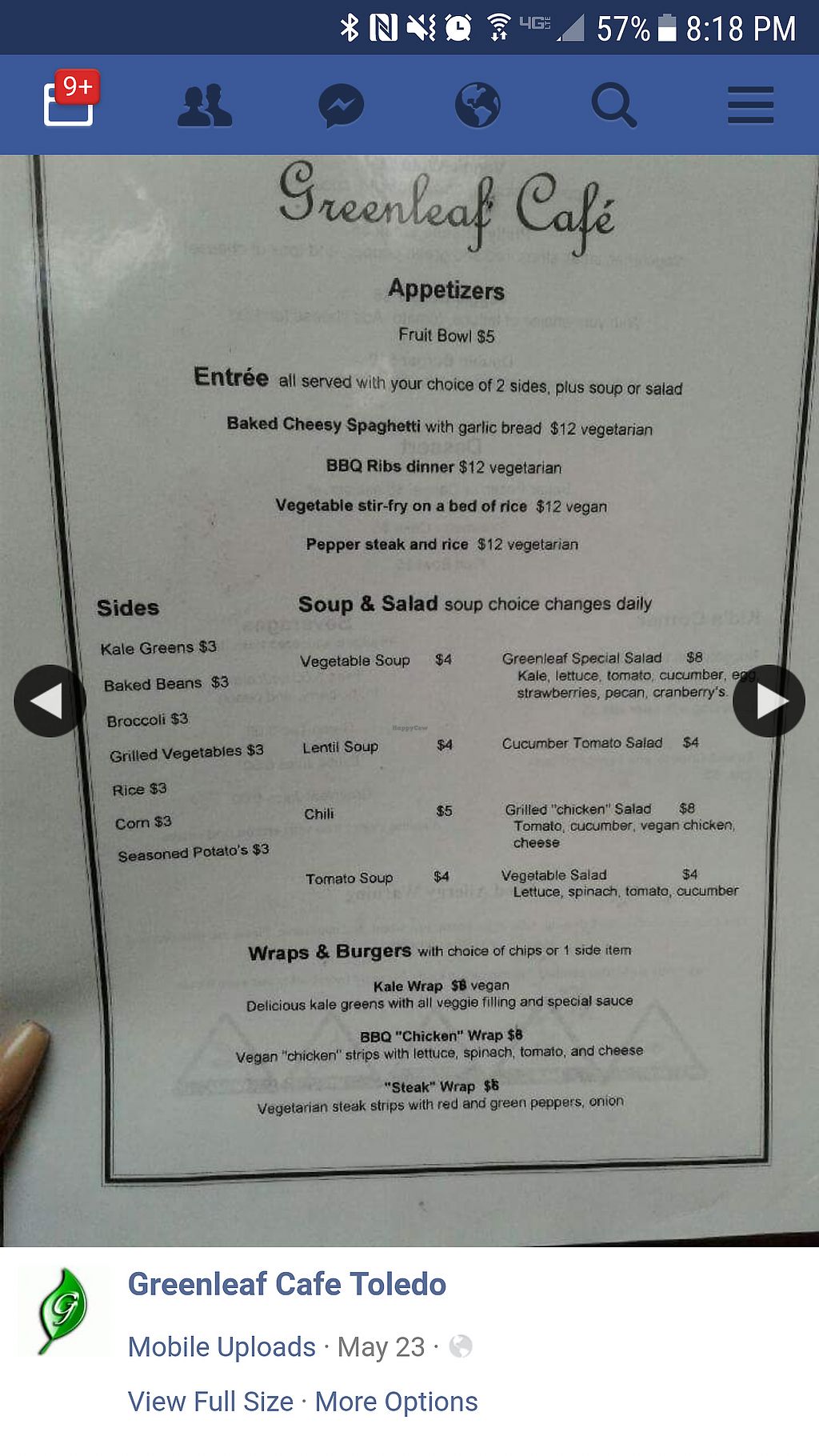 As of May 2017, the only vegan & vegetarian restaurant in Northwest Ohio. Friendly staff serves vegan ribs & chicken wraps, among other vegan items. All of the entrees come in two sizes and served with a soup or salad. Opened March 2017. Live music. Confirmed closed July 2018.