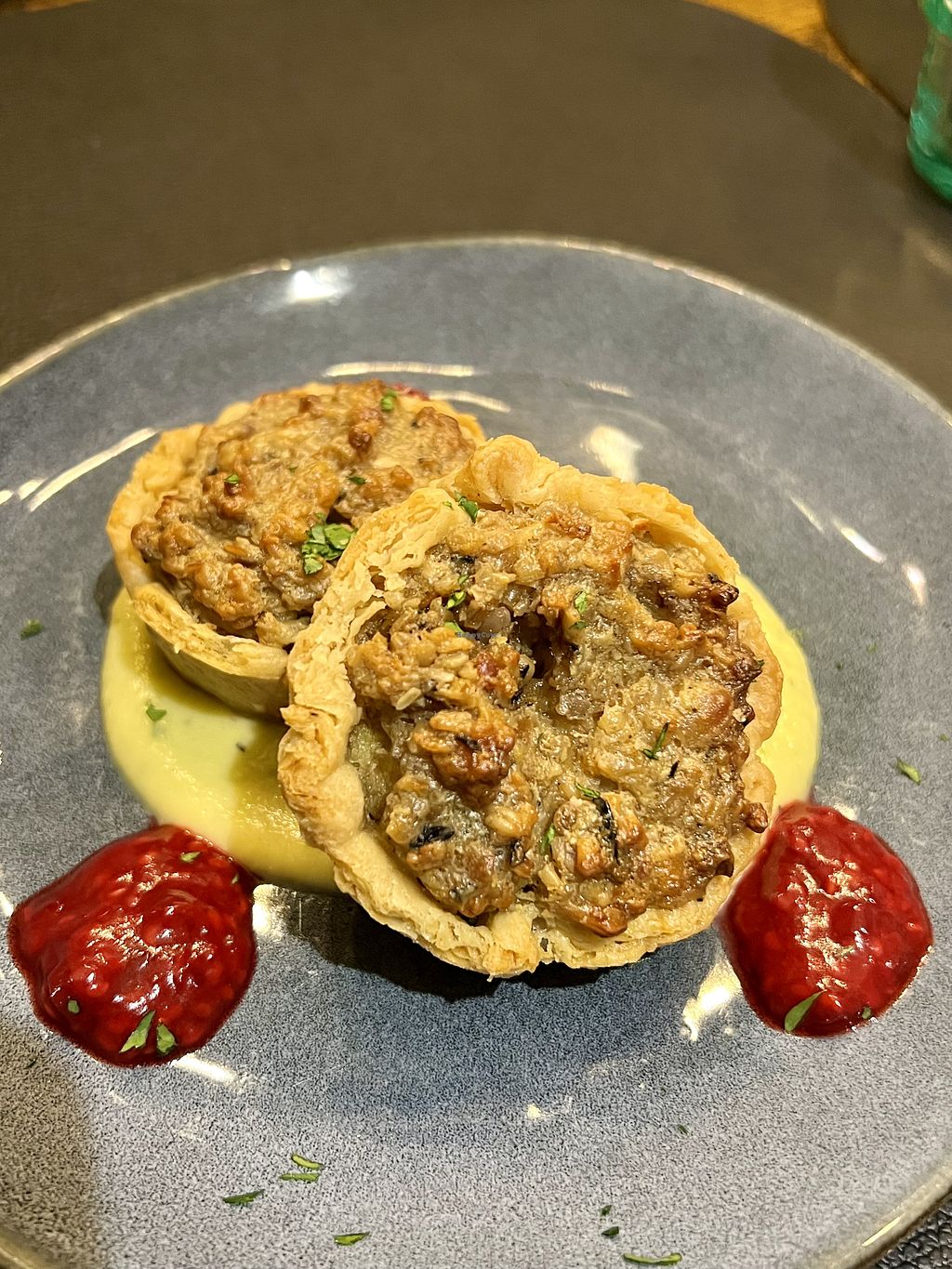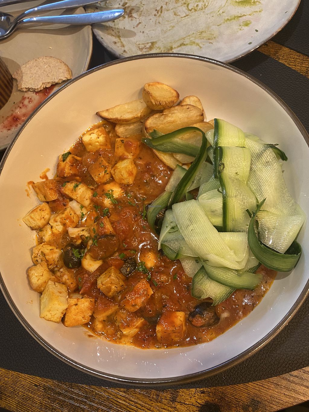 Evening menu: we got the starters of haggis tarts with raspberry relish and neep puree & a Miso tofu, whisky caramelised smoked pineapple and red pepper skewers. For Mains: Tagliatelle with tomato sauce, ‘meatballs’, a garlic crumb and lemon greens. Also a Mezee salad plate with walnut and aubergine puree, bahara and spiced squash, yoghurt dip & flatbread.