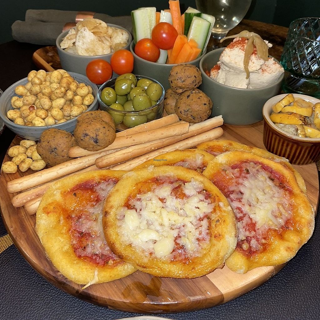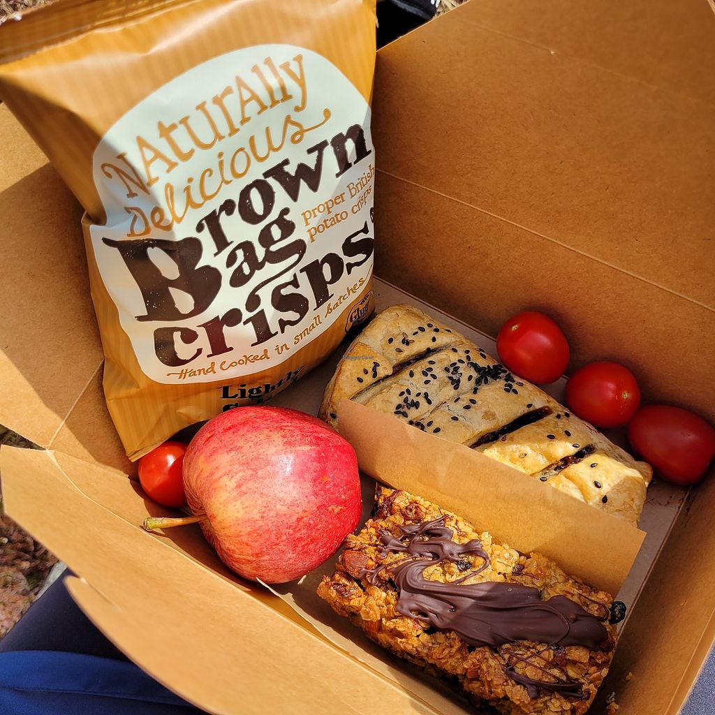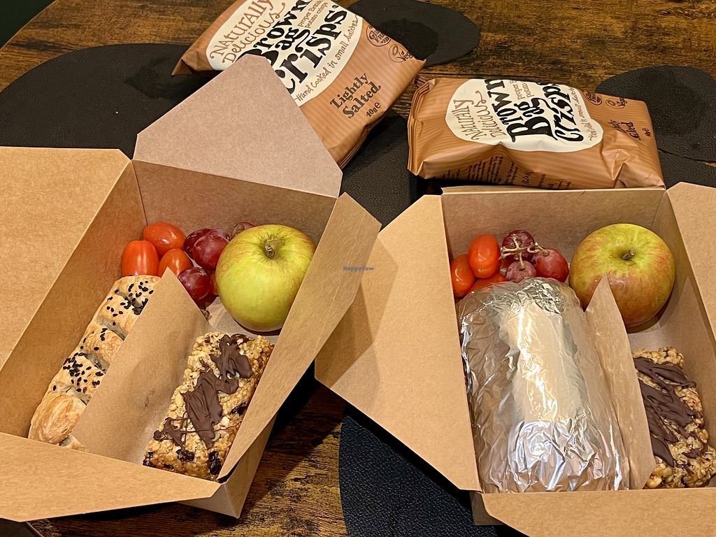 Packed lunches: we got haggis and onion chutney sausage roll. Reuben ciabatta with ‘pastrami’, cheese, sauerkraut, pickles & mustard mayo, and it came with crisps, fruit & flapjacks. The packed lunches were so big we were still eating bits a few days later. We also got a film night platter (instead of mains) and it was surprisingly filling & great to graze on #Veganuary
