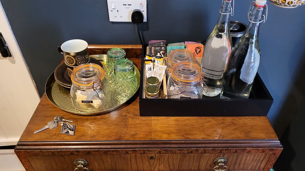 Books, DVDs, games are all available to borrow, there are miniature bottles of soya and oat milk in the mini fridge. Shortbread was left for us to enjoy.