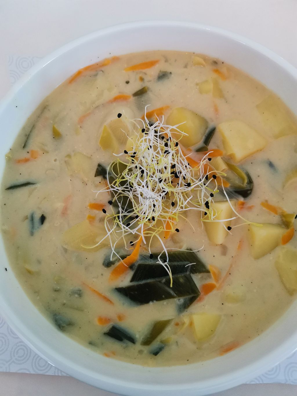 Greentrees recently opened a new branch in Oberkassel. They offer healthy vegan and vegetarian snacks, including bowls for breakfast and lunch, as well as a daily hot dish, delicious sandwiches and cakes. Drinks range from cold-pressed juices and vegetables, smoothies, to various coffees with plant-based milk. My selection today—leek and potato soup and oat milk coffee—was very good. The service is very friendly, but you have to ask if your chosen dish is vegan. Unfortunately, this isn't indicated on the menu. The two-person tables wobbled a bit, the atmosphere seemed light and cool, and it was indeed quite cold in the room. The menu seemed unfinished, consisting only of several sheets of paper of varying sizes, loosely held together with a clip. Payments can be made by debit or credit card. Reservations are not possible.
