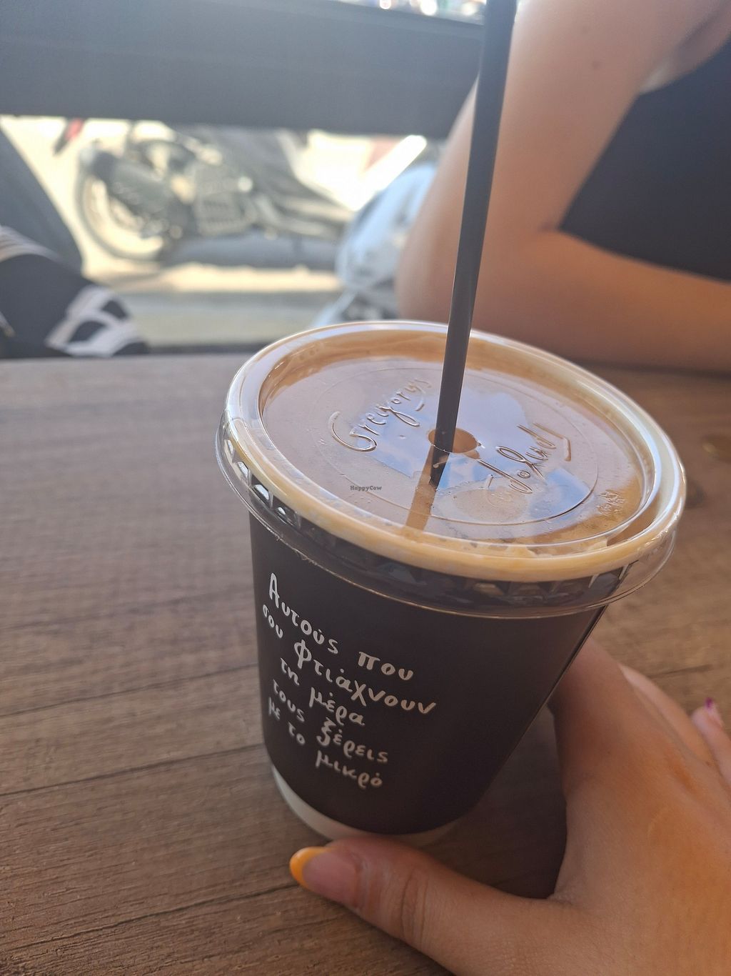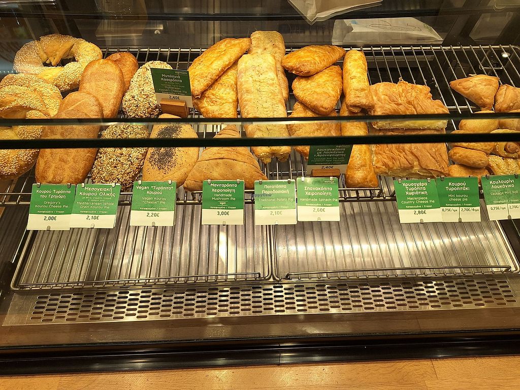 Serves meat, vegan options available. Greek chain restaurant offering vegan items on its menu which is also in English. Choices include baked savory pies, cakes, snacks, and falafel wrap. Serves coffee and juices. Open Mon-Sun 6:30am-6:00pm.