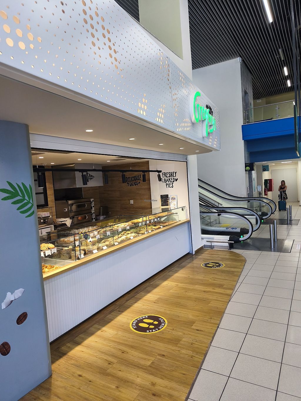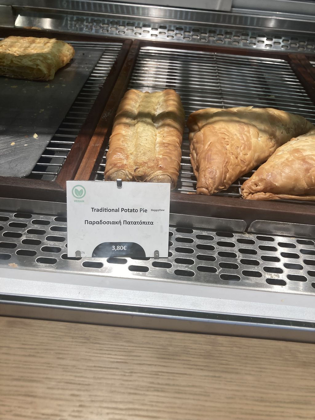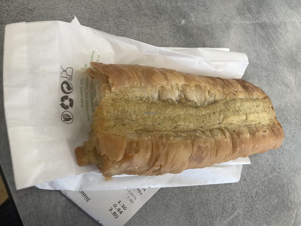 Serves meat, vegan options available. Greek chain restaurant offering vegan items on its menu which is also in English. Choices include baked savory pies, cakes, snacks, and falafel wrap. Serves coffee and juices.