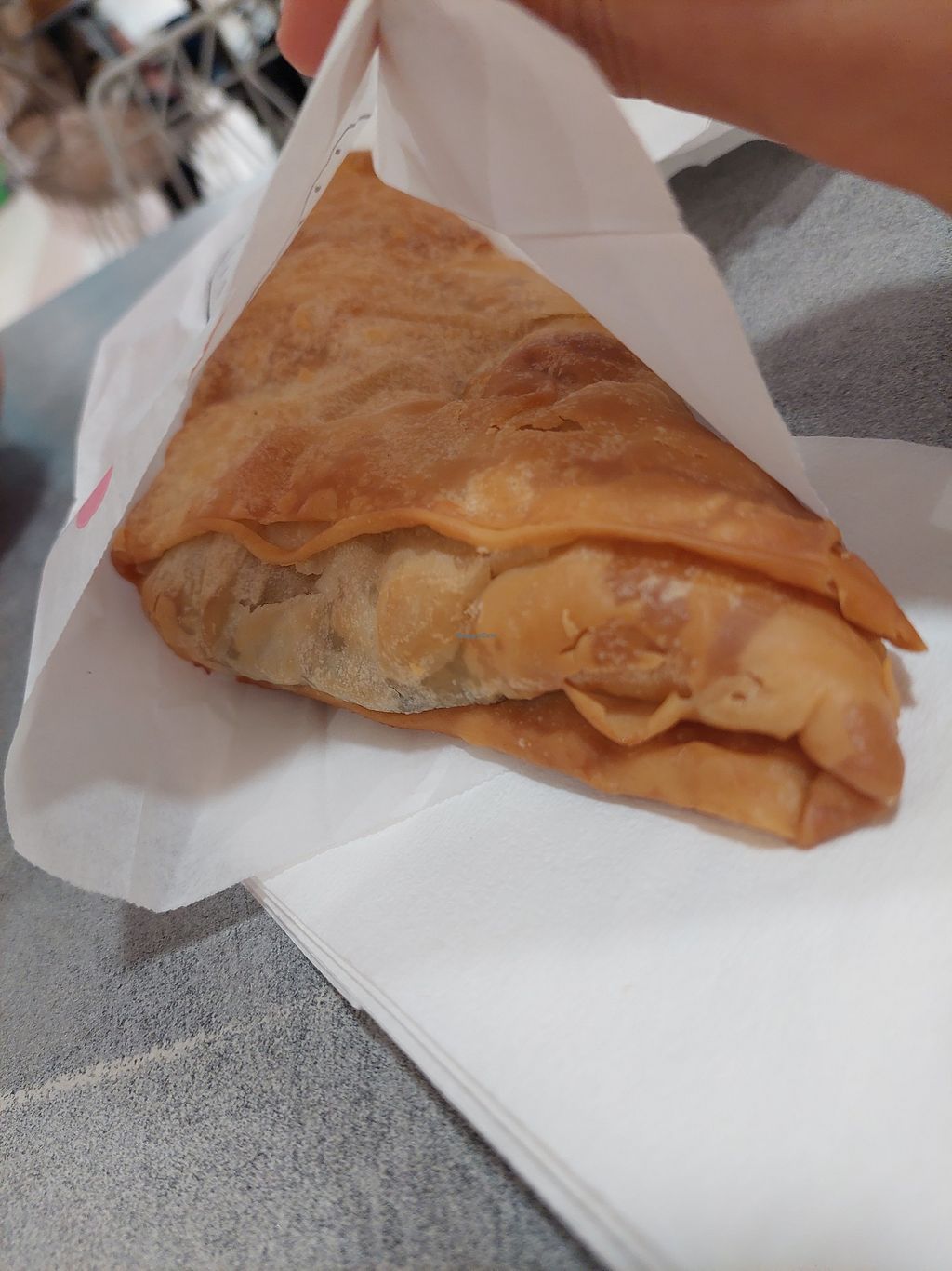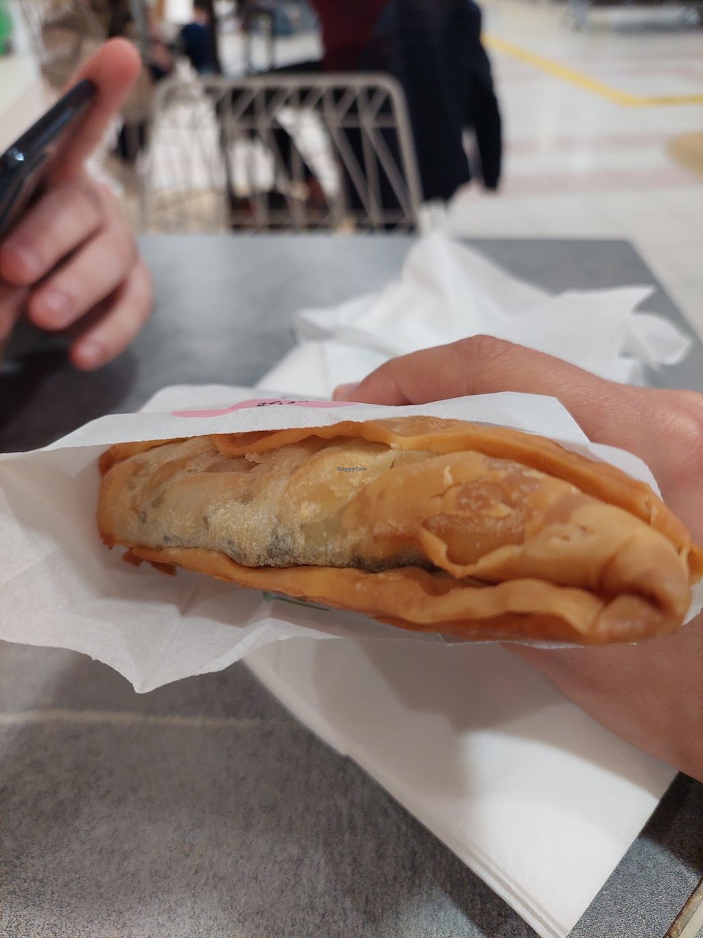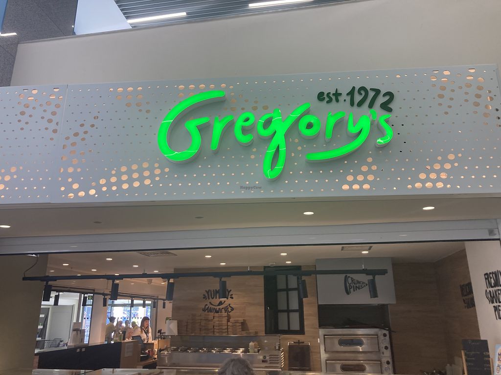 Serves meat, vegan options available. Greek chain restaurant offering vegan items on its menu which is also in English. Choices include baked savory pies, cakes, snacks, and falafel wrap. Serves coffee and juices.