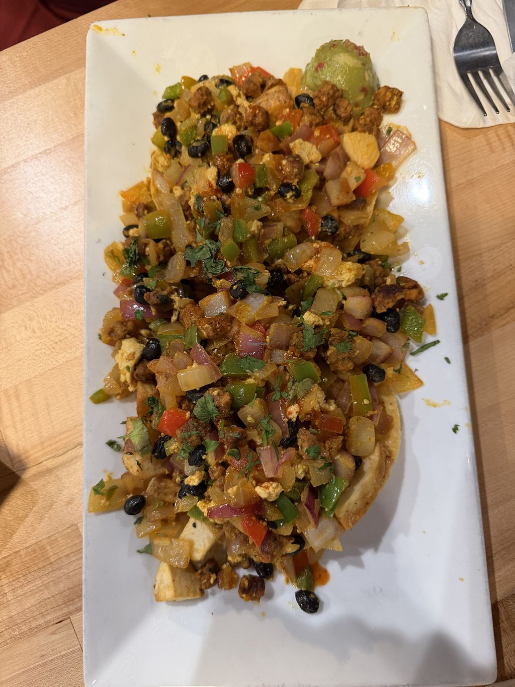 I went here for breakfast and tried the no huevos rancheros. The service was very good. The portions are very generous. The guacamole was delicious but the potatoes lacked seasoning. I was also disappointed to see no vegan options on the lunch menu. I would like to go back and try the banana French toast which was another vegan choice.
