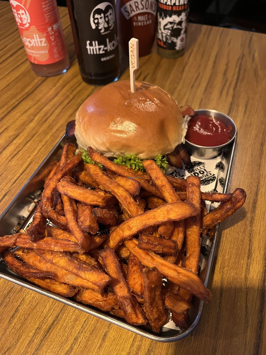 Cheeseburger (vegan) mit Sloppy Fries (auch vegan)