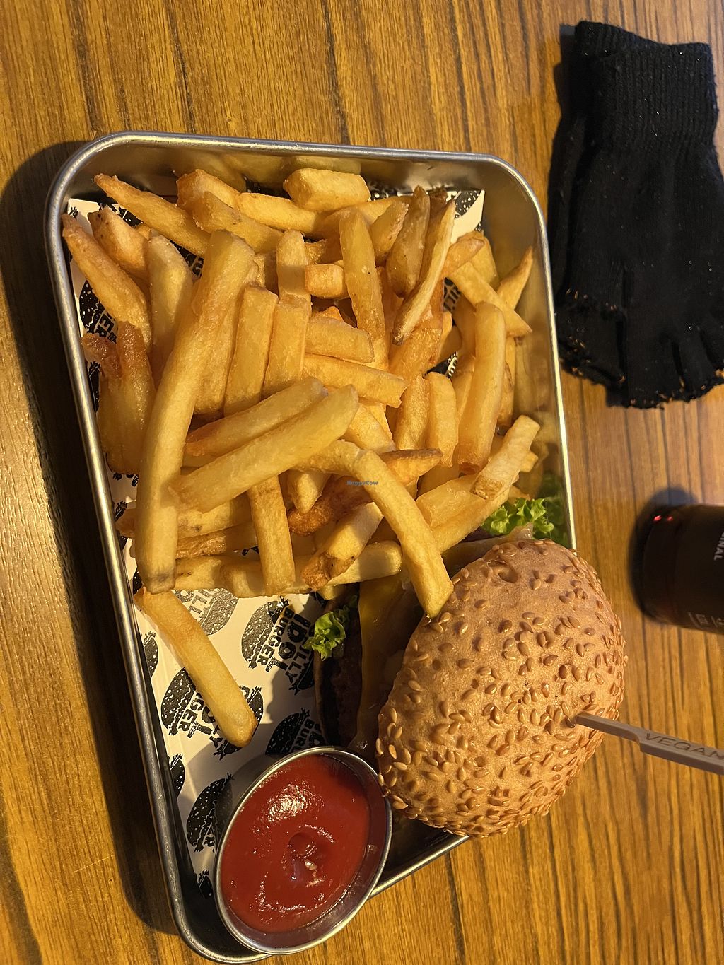 Burger menu with shiitake burger, asian salad and the special fries (d…