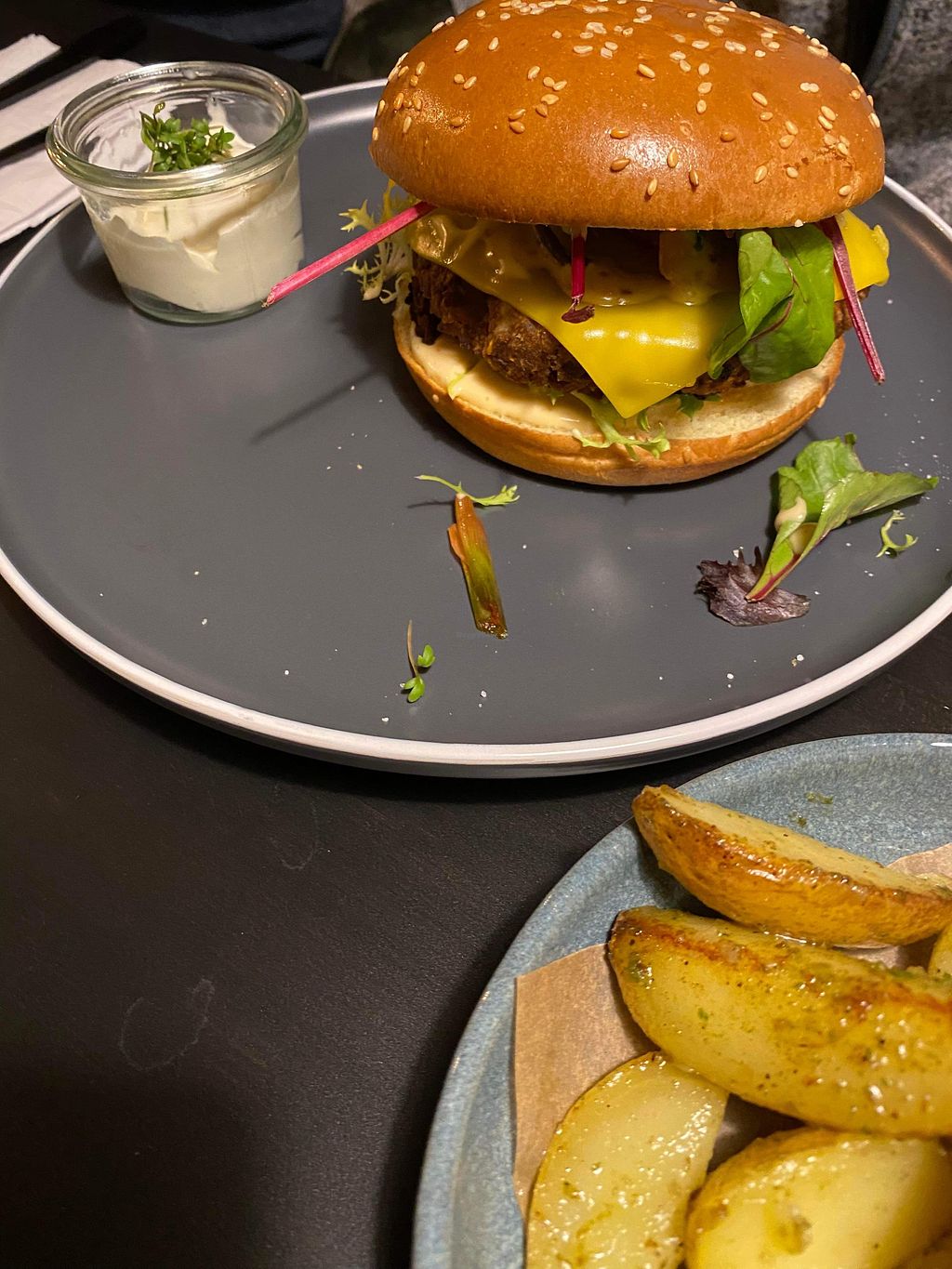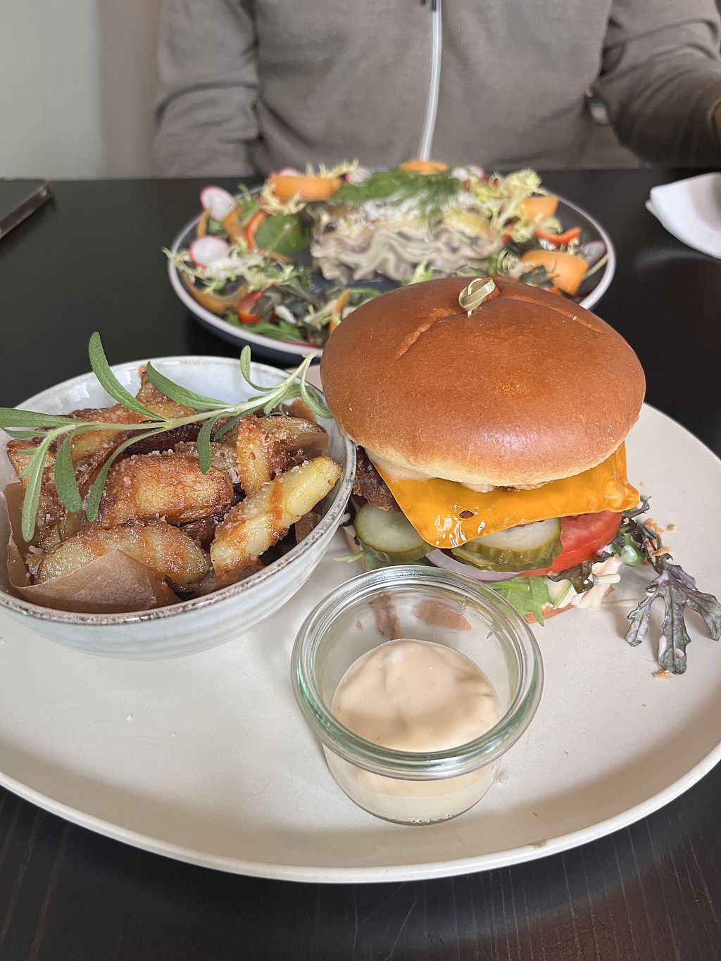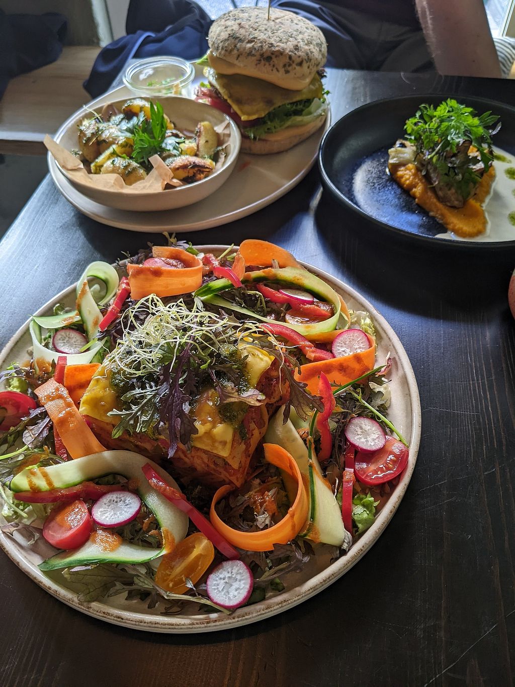 Die zum Burger servierten Kartoffeln mit Pesto und Käse waren mein persönliches Highlight. Der Burger war auch gut. Das Curry für meinen Geschmack etwas scharf. Der Chili Hummus mit Gemüsesticks war eine leckere Vorspeise. Große Portionen, die Hauptspeisen allein reichen. Leider hat ein Dessert nicht mehr rein gepasst, hätte gerne noch das Crème Brûlée probiert, das klingt sehr fancy. Die anderen Gerichte klangen auch sehr gut und ich würde gerne wieder kommen.