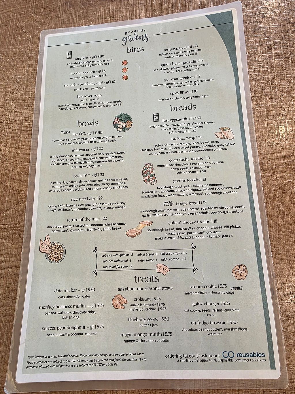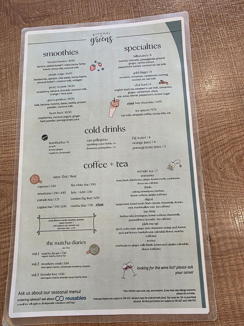 Grounds and Greens exceeded my expectations. Headed to the States for a doctor appointment and used a Plant Curious deal here as I drove through. So happy i did! Nowhere does it say it’s Ⓥ but it is! GF options in the dessert case. Lattes, teas, frothy oat milk, Pom juice, booch. What I love most is G&G is headed towards zero waste - currently no to-go containers so bring your own if you want to take it with you. I saw a man in a nice suit come in and collect two stainless steel containers - presumably with his to-go order inside - and jet. Everything is fine cafe dining if that makes sense. Perfect for the city and I wish we had one in Vancouver.
