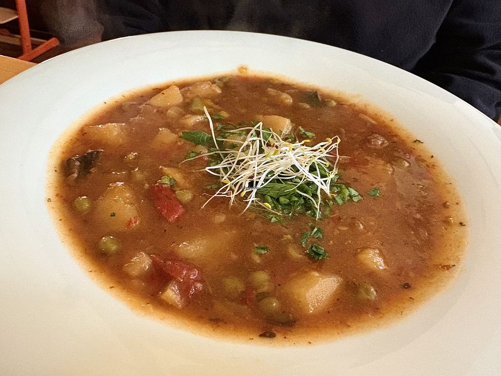 …das Essen ist aus meiner Sicht eher Richtung veganer „Hausmannskost“. Das Essen war von der Qualität und dem Geschmack mega. Lediglich das Dessert schwächelte ein wenig. Der Käsekuchen war in einer kleinen Auflaufform und sehr dünn und trocken. Das Highlight war der Gulascheintopf als Vorspeise. Als Hauptgericht hatten wir Zwiebelfleisch und Pasta. Beides absolut zu empfehlen. Nur das Ambiente ist ein wenig Oldschool. Lobenswert ist auch eine feine Auswahl an alkoholfreien Weinen und Longdrinks.