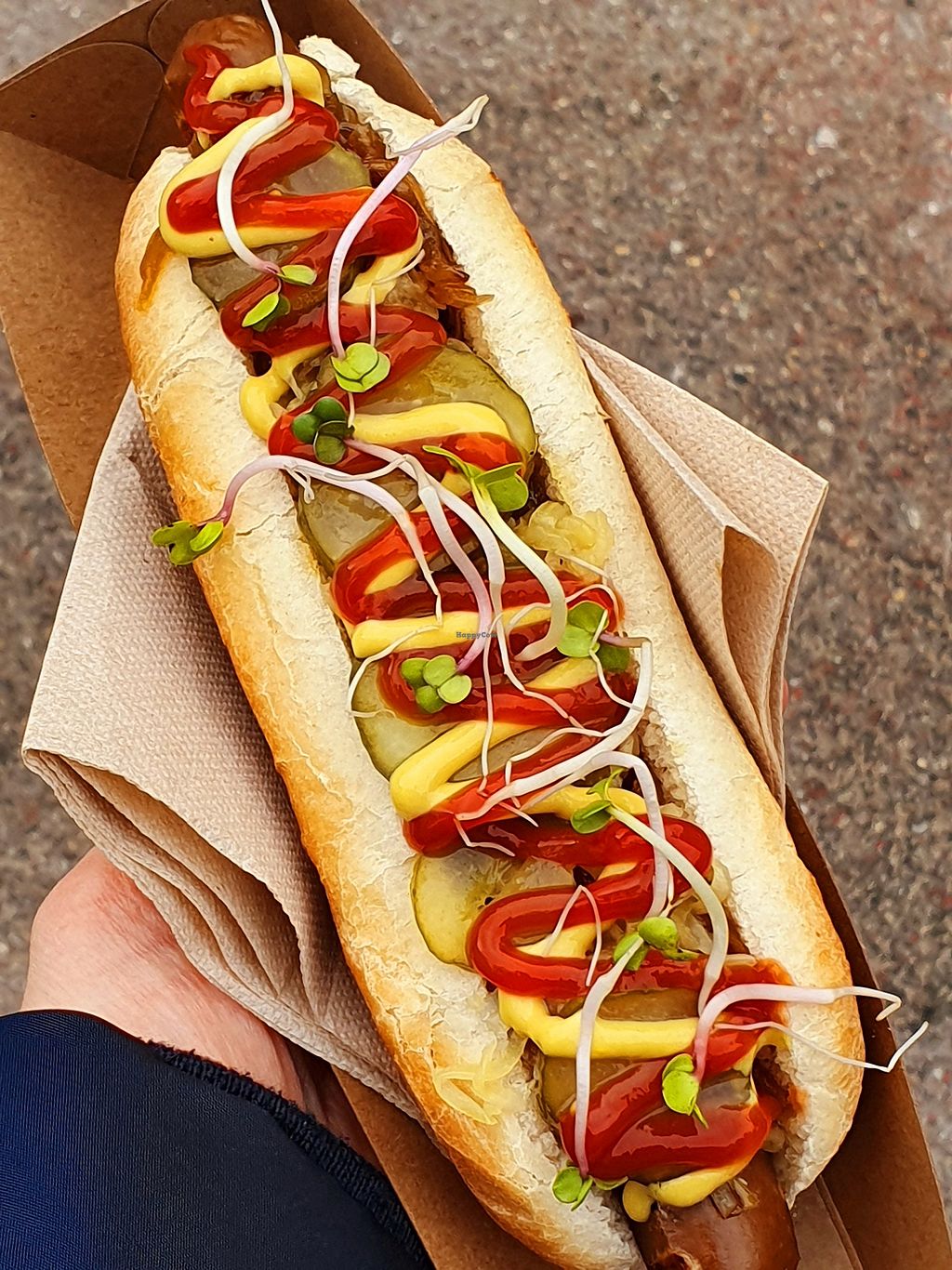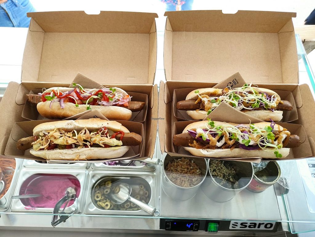 What a nice surprise having a 100% vegan food truck with an extraordinary offer of different hot dogs in town! Apart from the hot dogs you get salads and changing soups as well. Today's goulash soup was extremely tasty and full of flavour, it was simply perfect! The accompanying bread was so fresh as it just came out of the oven. Very friendly staff. Earns a long queue of customers 😊