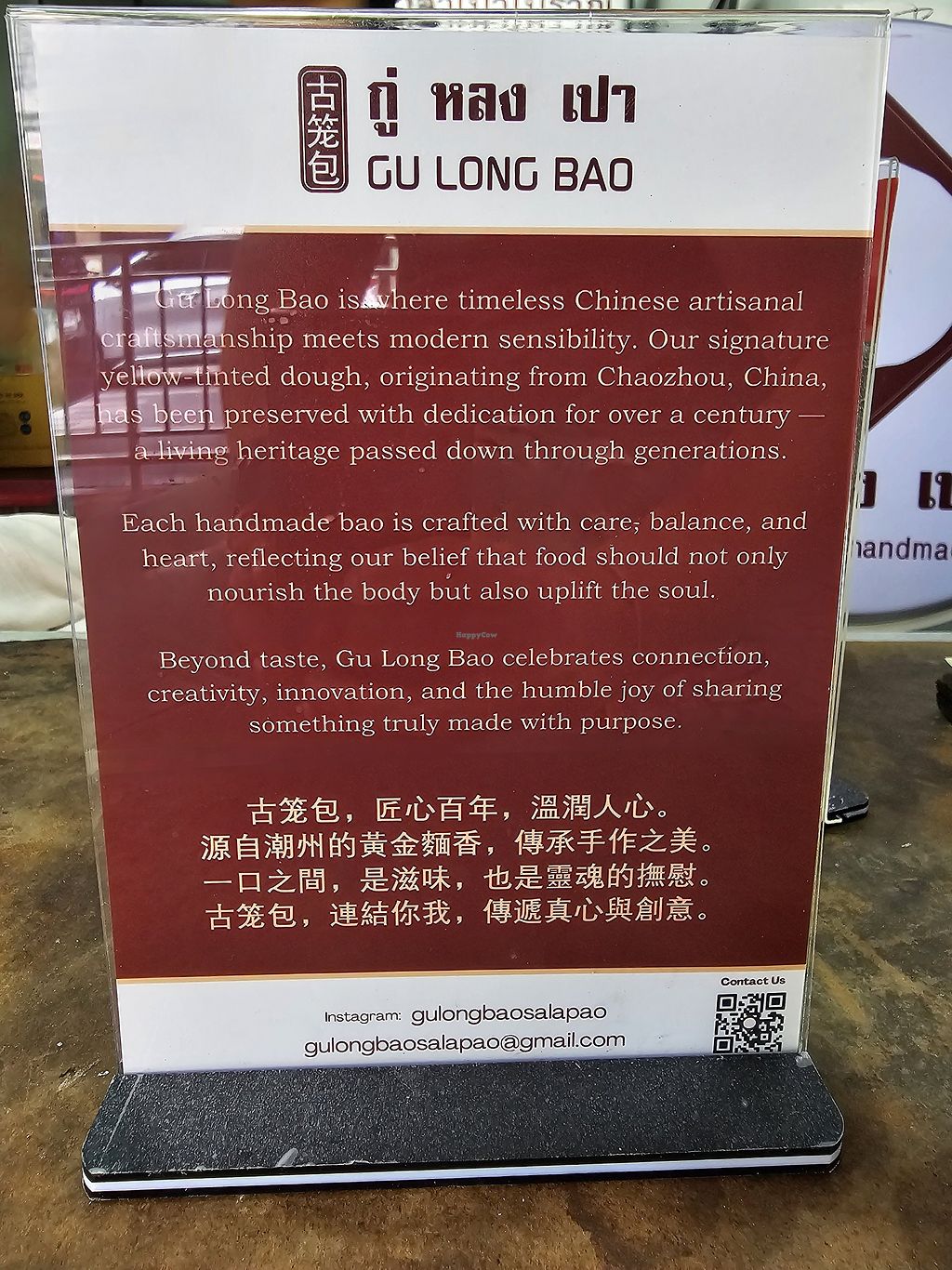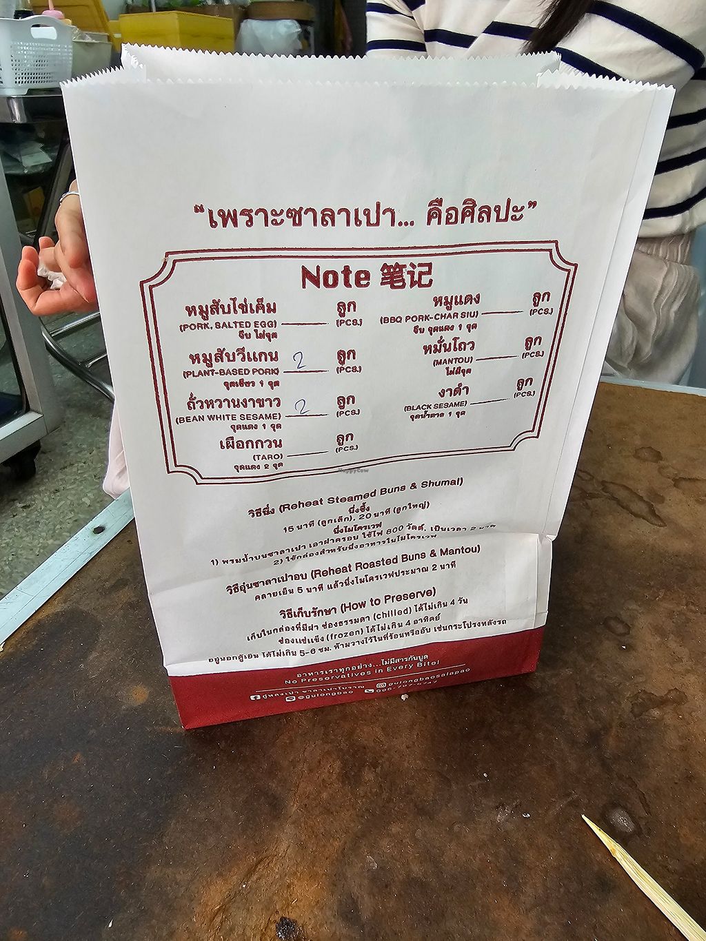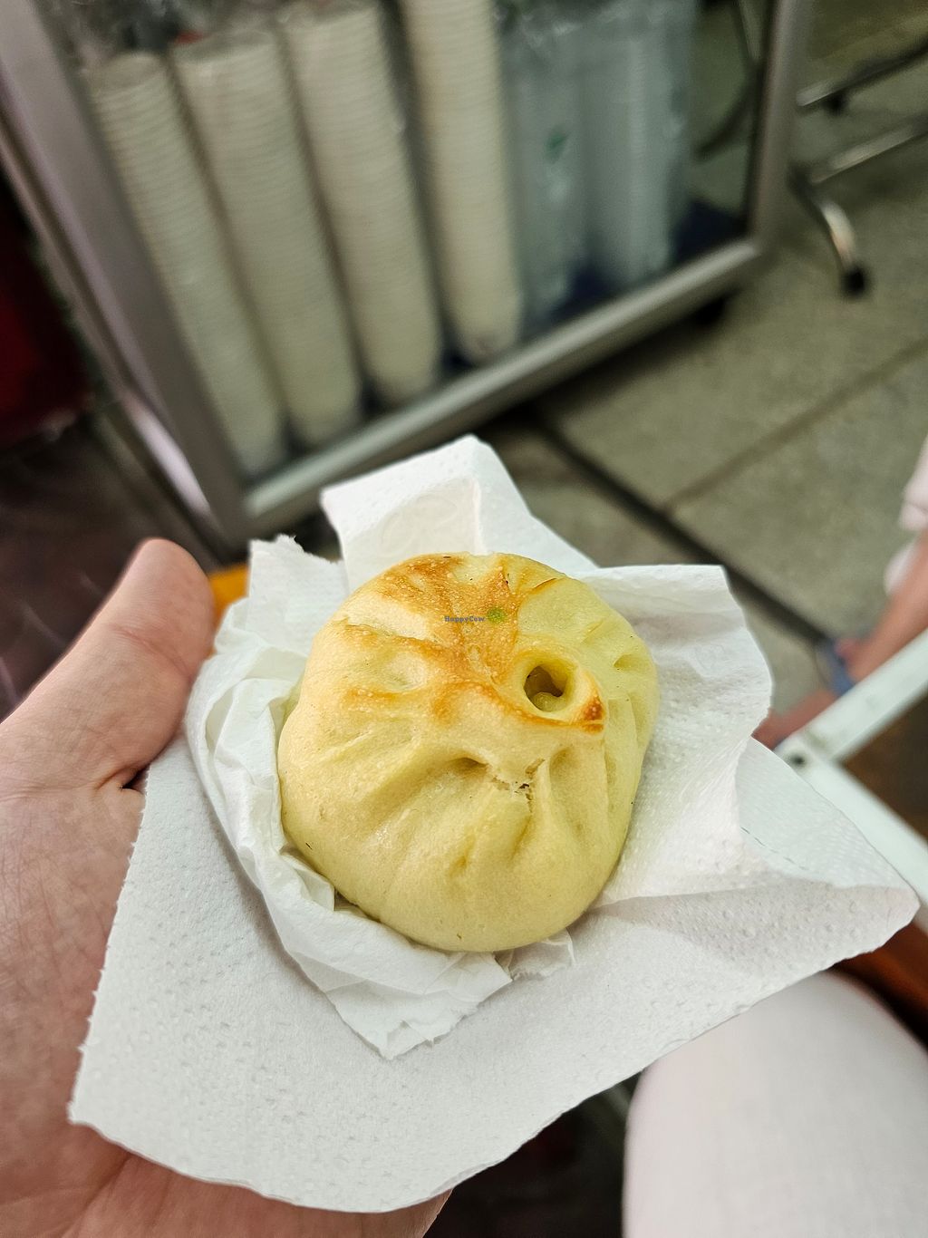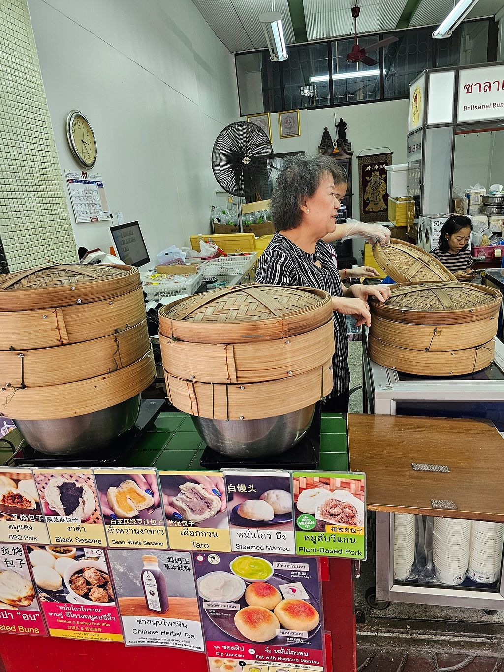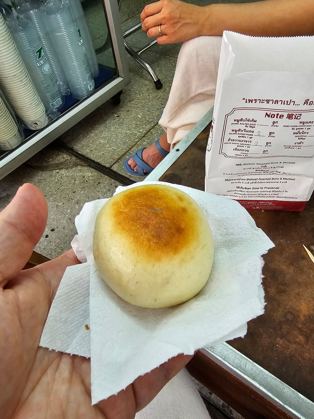 Amazing! Love that there are clearly marked options. They say vegetarian, but they’re vegan. I had the black sesame and pork bao. Black sesame was only 17thb and 22 for the vegan pork. Owner is friendly. Steamed to perfection. Only takeout, but two small wooden chairs infront so you can eat while they’re hot!