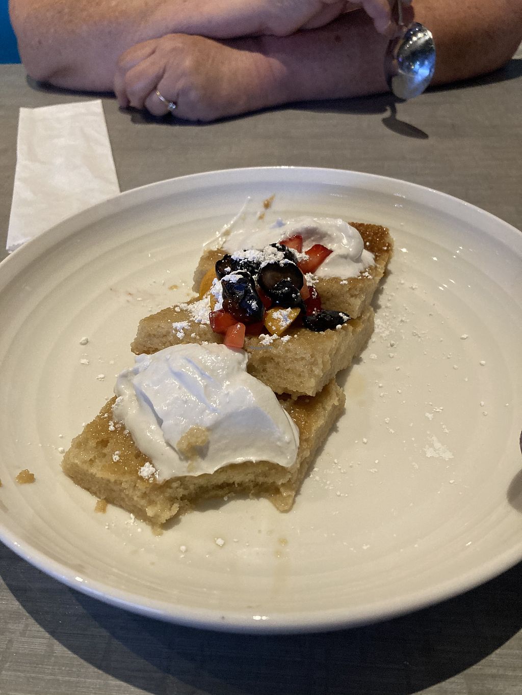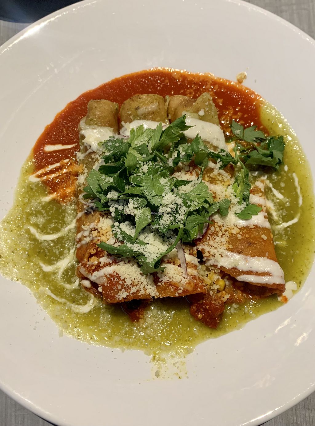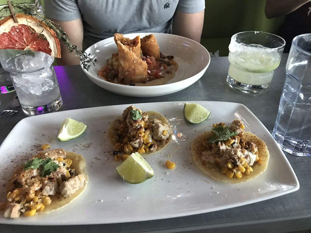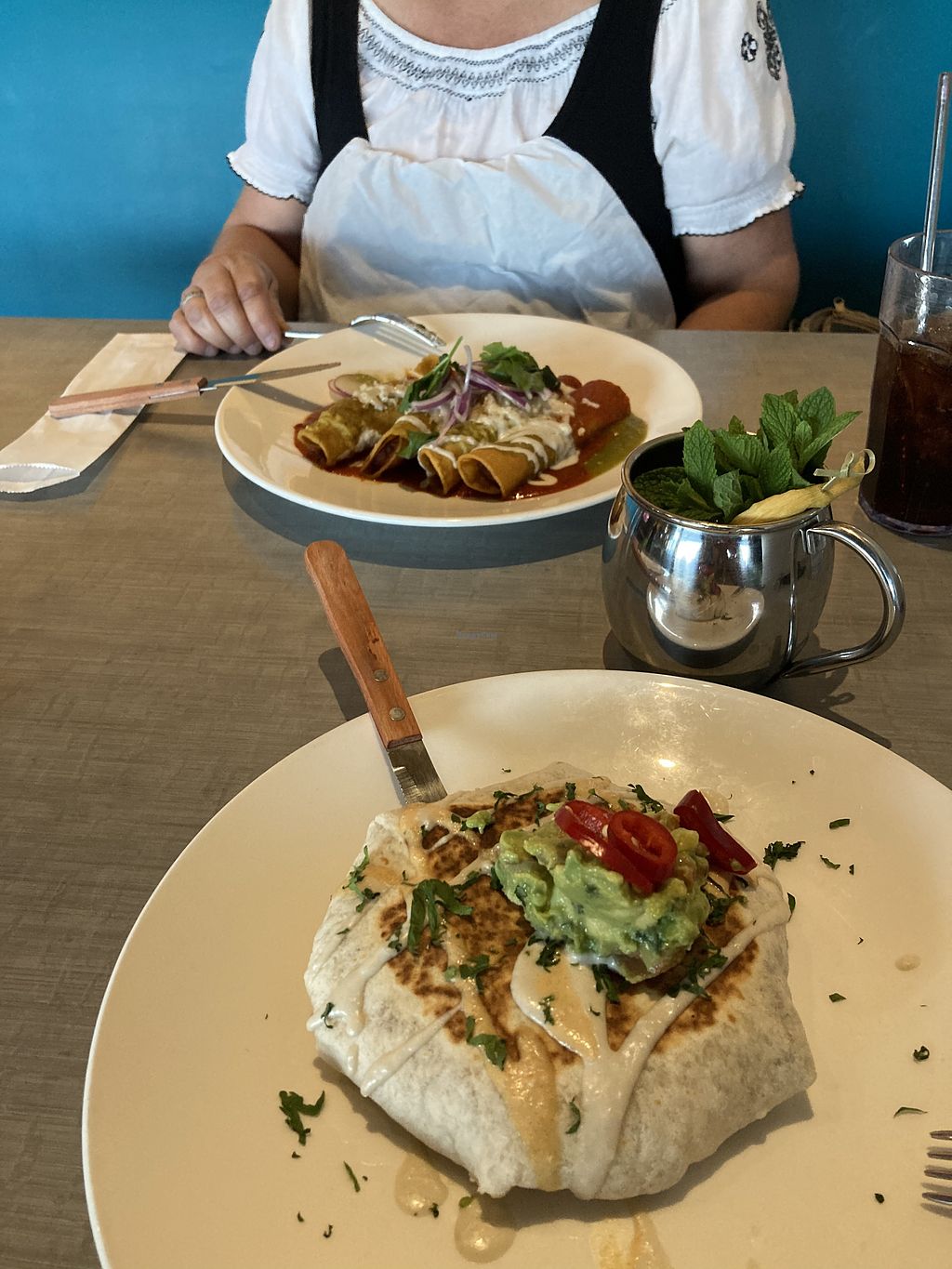 We ate here last night for the first time. It has an upbeat vibe. We came for supper but it looks like a great place to come for drinks during happy hour. We had the enchiladas and the grilled guac pocket. Both were excellent. The serving sizes were just right. We finished them and had room for a shared dessert. We had the tres leches cake. It was large, maybe too large. Definitely should be shared. I had the Funky Donkey cocktail. It is a tequila version of a Moscow Mule. It was very good.