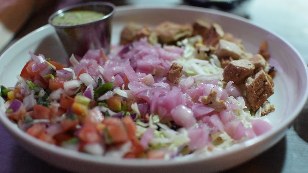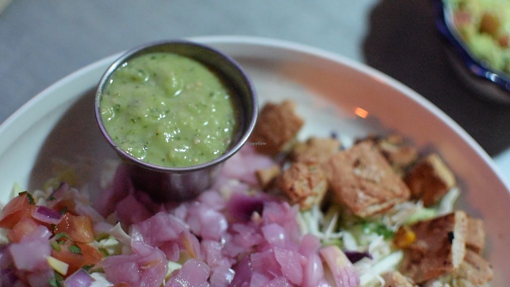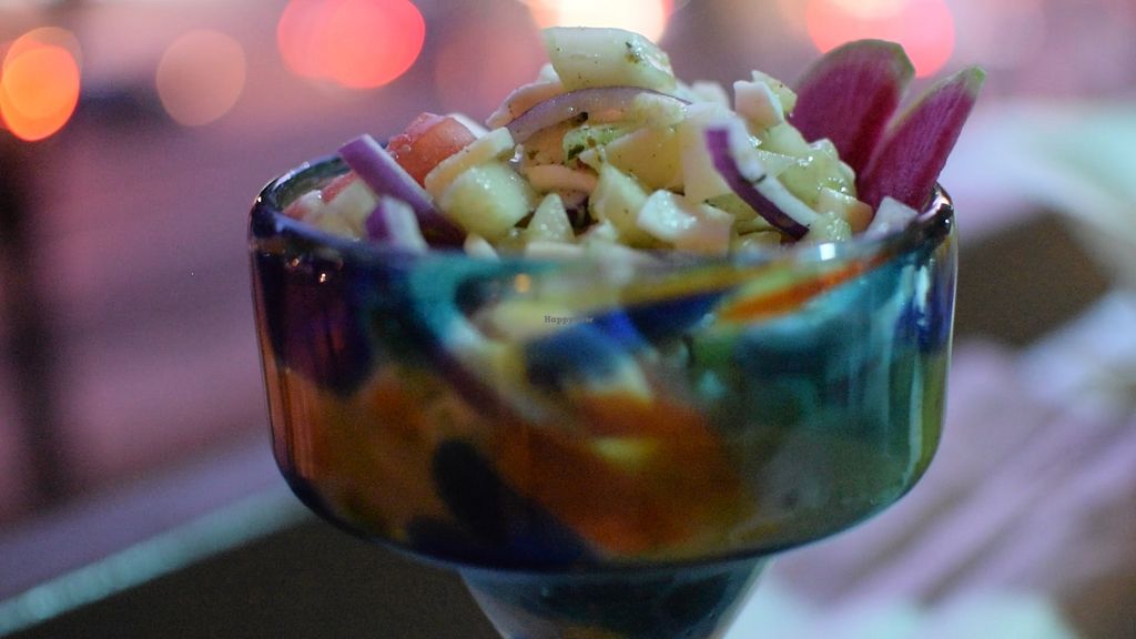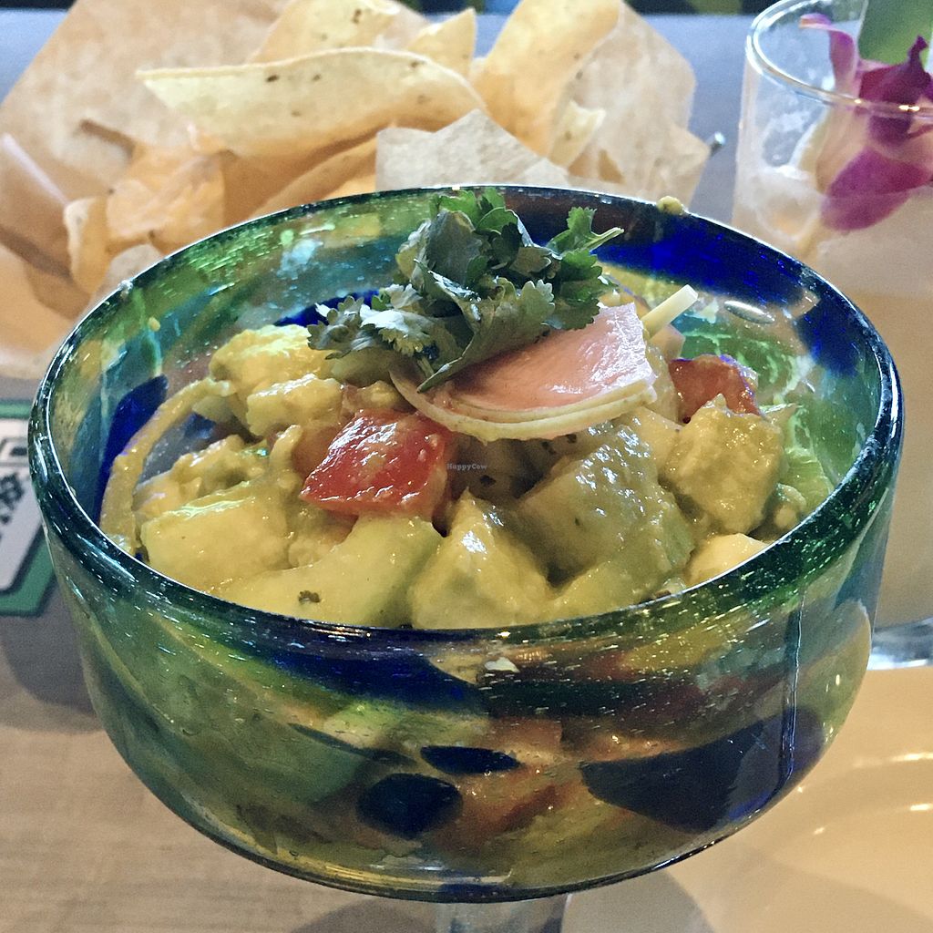 Overall I thought my food was okay, my friend devoured her food. I had the ceviche but it was mostly just onions and therefore had a strong(er) than usual vinegary taste to it (also lacked the typical lime accent and there were no avocadoes in it which came as a surprise). Also my taco salad had quite a bit of onion and tomato compared to lettuce and seitan "chicken". The mock meat didn't taste realistic but it was still okay. I liked the cashew cream (I replaced that for vegan cheese), however, don't pour too much into your food because the flavor is strong. My vegetarian friend ordered chips and guac (they were out of the seasonal guac and brought it to us without asking if we wanted the regular guac, my friend had them remove it from the bill), and she ordered enchiladas with vegan cheese which she said were amazing. The outside patio is surprisedly boring to dine on compared to the inside which has a chill vibe to it. Also they were out of all three desserts.