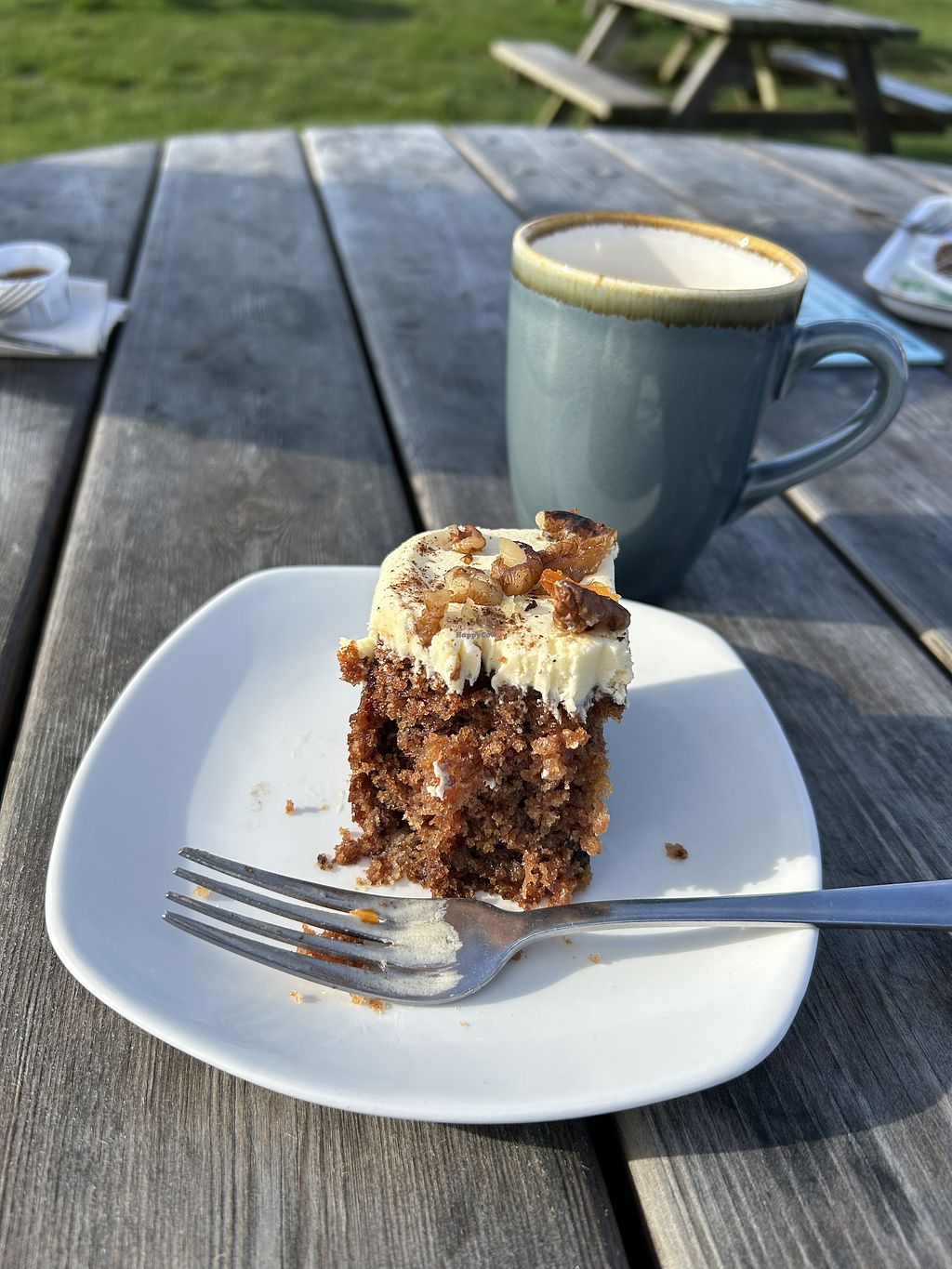 This cafe is in a stunning location. The outside of the building doesn’t give the best impression but being high on the cliffs means it is open to the elements. Inside, the decor is simple, it is clean and spacious. The staff were all bright and cheery despite it being close to closing time on a busy summer holiday Sunday. They offer oat milk, my husband enjoyed an iced latte, my American was a little weak for my taste but ok. We had a huge chunk of vegan carrot cake loaded with walnuts and topped with frosting. Two of us shared that and half really was enough for me. Others in our group ordered the chocolate and coconut flapjack and the cherry Bakewell. These are locally made and available in many cafes in the area it seems.