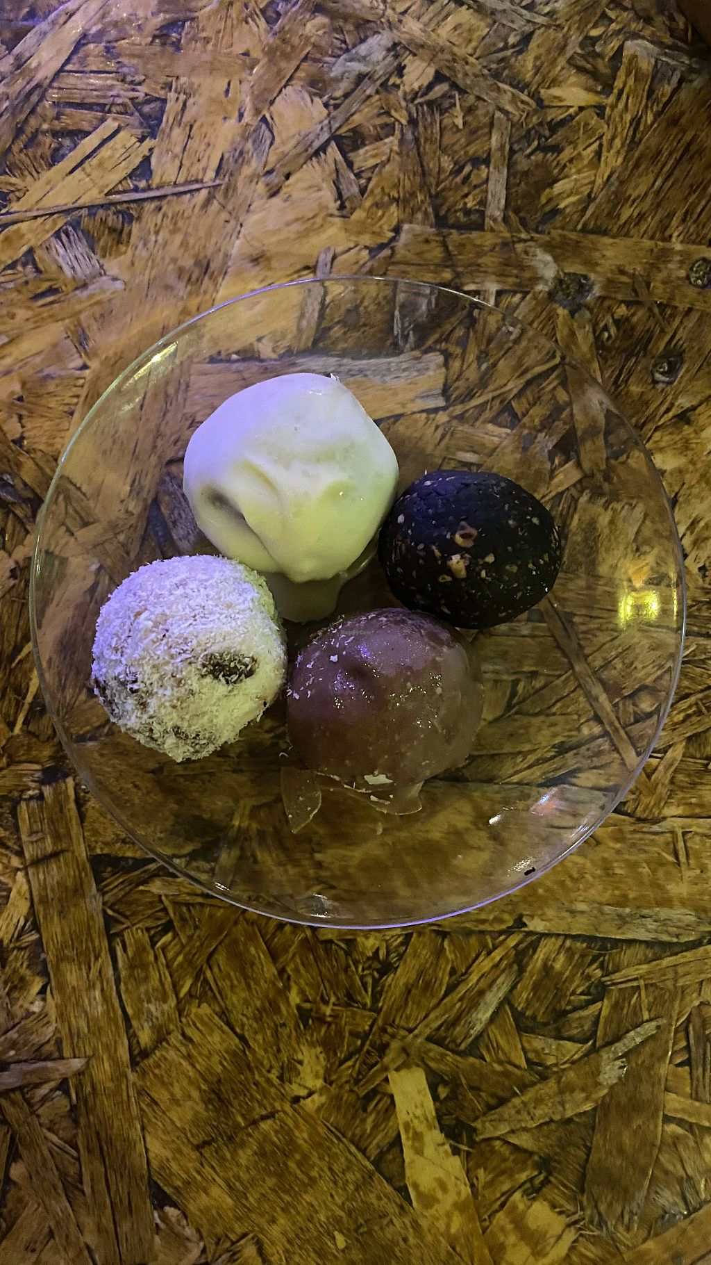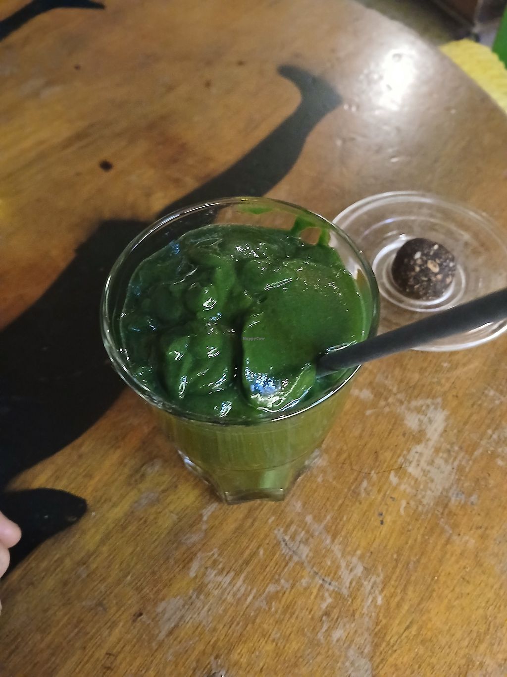 Coffee with soy-milk and bliss balls (peanut-choc, halva)