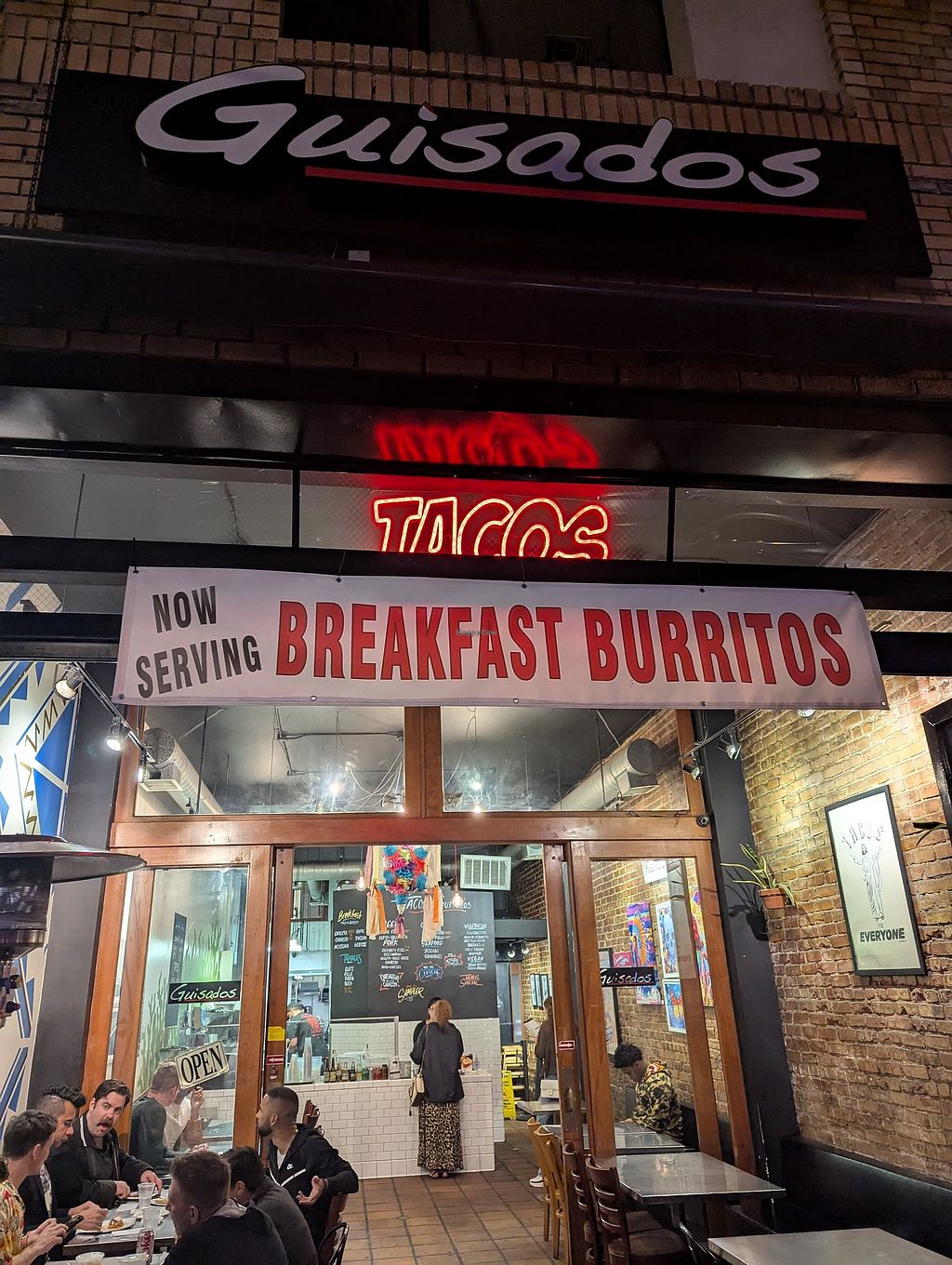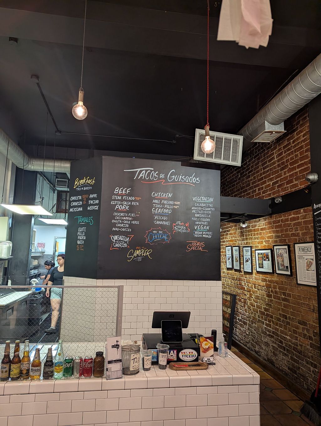 Serves meat, vegan options available. Taco restaurant offering two clearly labeled vegan tacos - "Vegan Medley" and "Vegan Peppers". Vegetarian tacos may be veganized upon request, such as the nopales. Open Mon-Thu 10:00am-10:00pm, Fri-Sat 9:00am-11:00pm, Sun 9:00am-9:00pm.