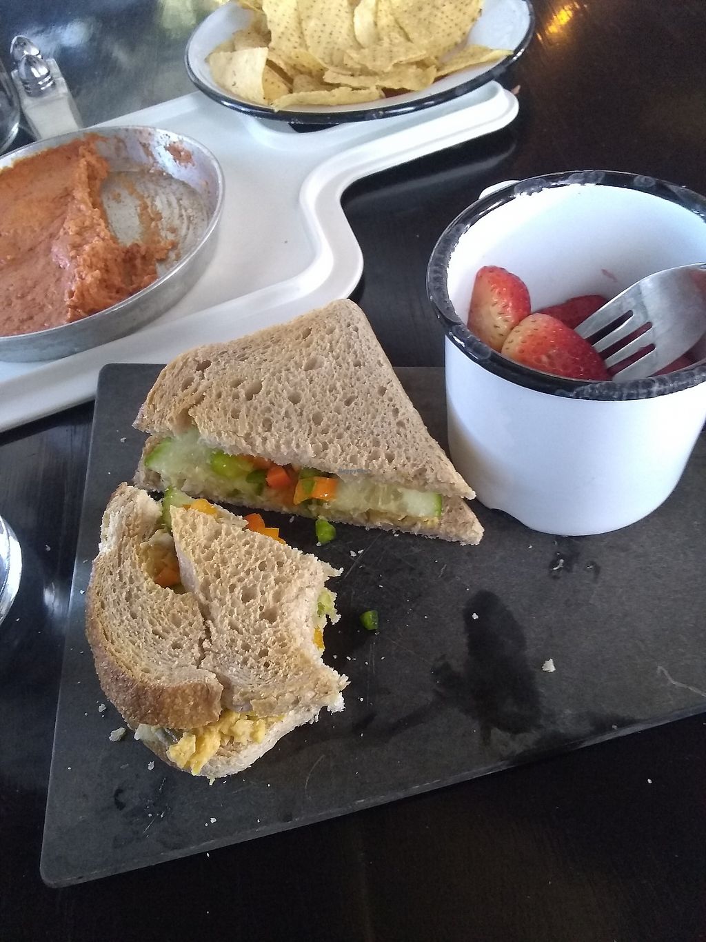 Only two vegan lunch options: salad or chickpea salad sandwich. I tried the sandwich and also "not yo cheese dip" with chips. Not bad.