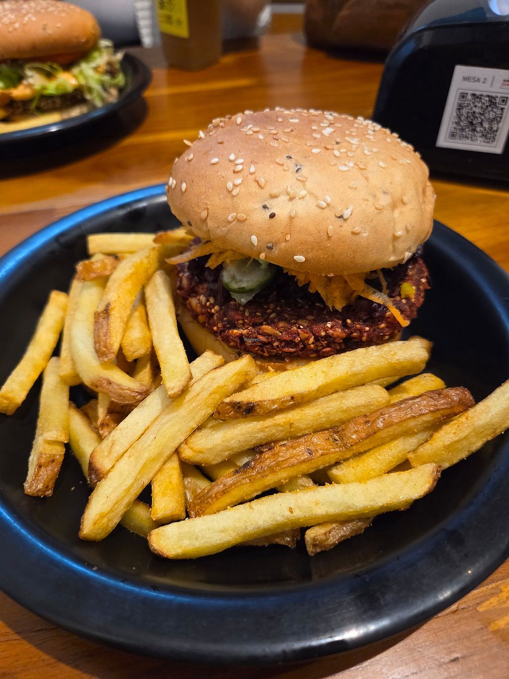 Burguer de feijão preto vegano com pão vegano, maionese de salsinha co…