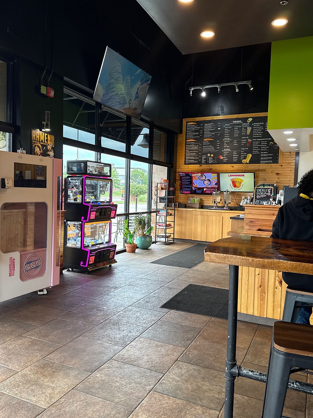 Serves meat, vegan options available. Anime-themed counter service Japanese restaurant with vegan choices. Menu includes customizable poke bowls and sushi burritos with tofu protein option and various vegetables as well as spring rolls and vegetarian ramen (omit egg). Plant-based milk alternatives available for boba tea. Open Mon-Thu 11:00am-10:00pm, Fri-Sat 11:00am-11:00pm, Sun 11:00am-10:00pm.