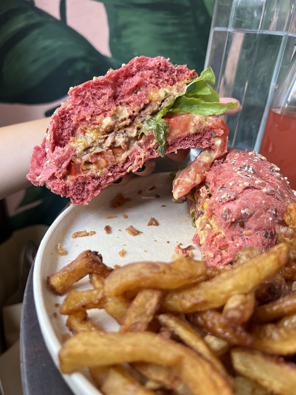 Petite salle agréable nous étions assis sur un canapé mais très confortable. Petite carte aussi (3 choix de plats) mais cela montre aussi le fait maison. Nous avons choisi deux cheeseburger qui étaient vraiment très bons ( les meilleurs burgers vegans que j'ai jamais mangé). Un pain aux graines et curcuma très moelleux, un steak et fromage vegan très réalistes, une petite sauce très gourmande et des pickles d'oignons pour la fraîcheur. Avec ça un bol de frites maisons à la fois a fois croustillantes et moelleuses. Rien à dire ( peut être proposer une petite salade sur le côté pour un peu plus de fraîcheur ?) J'ai hâte de revenir tester d'autres plats. Pour le prix c'était 19 euros le burger plus les frites, un peu cher mais la qualité était au rendez vous.